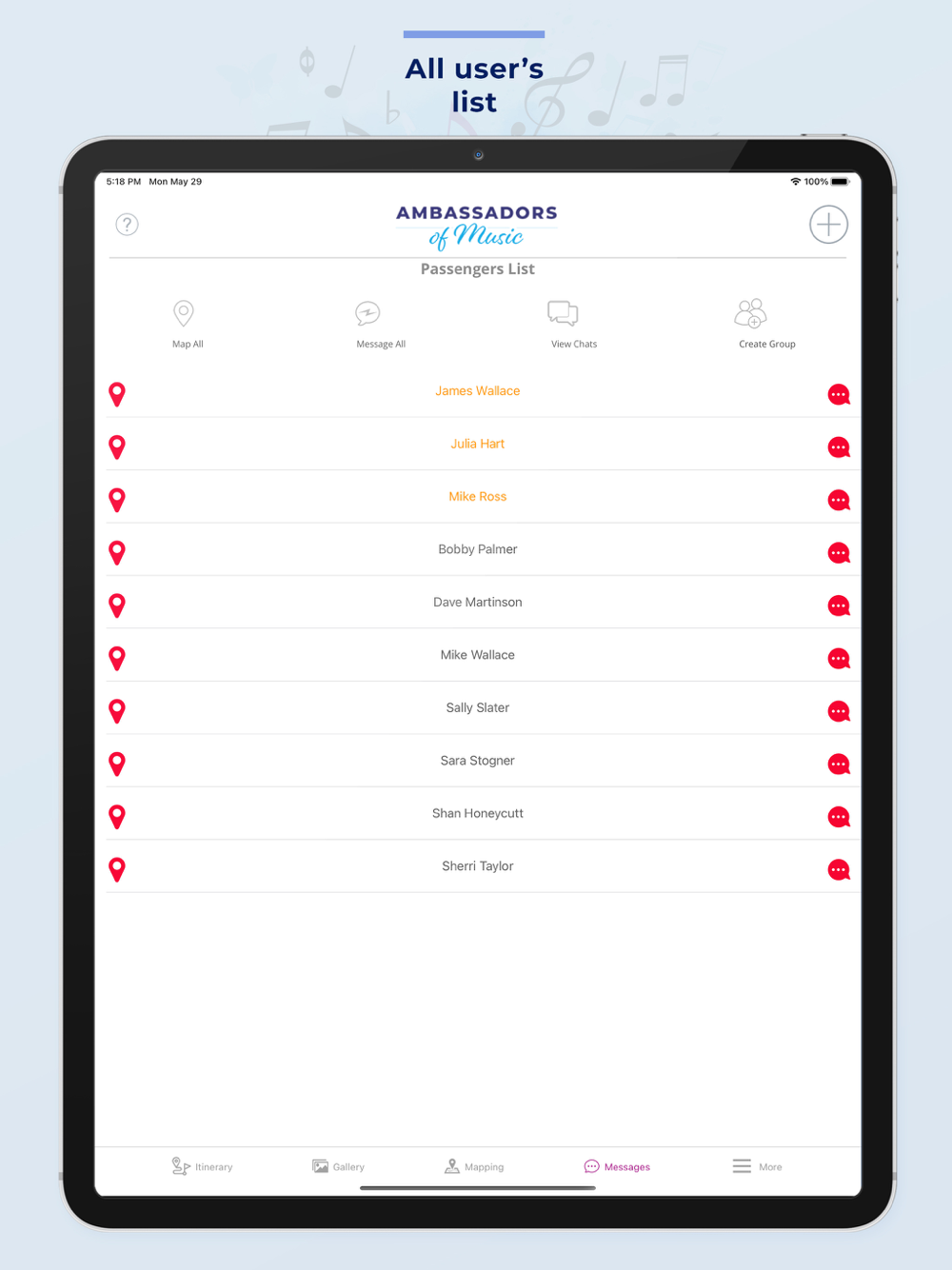 The app helps manage communication and offers a traveler locator feature for an added safety benefit. This allows for the group to find each other on a map. It turns on the day of departure and off the day you return. For communicating, group leaders can message the entire group or an individual traveler. Travelers can message the group leaders, but not each other. Important documents like rooming lists, rules, assignments, plans, and itineraries can be uploaded through the app by the group leader so all communication is in one place.