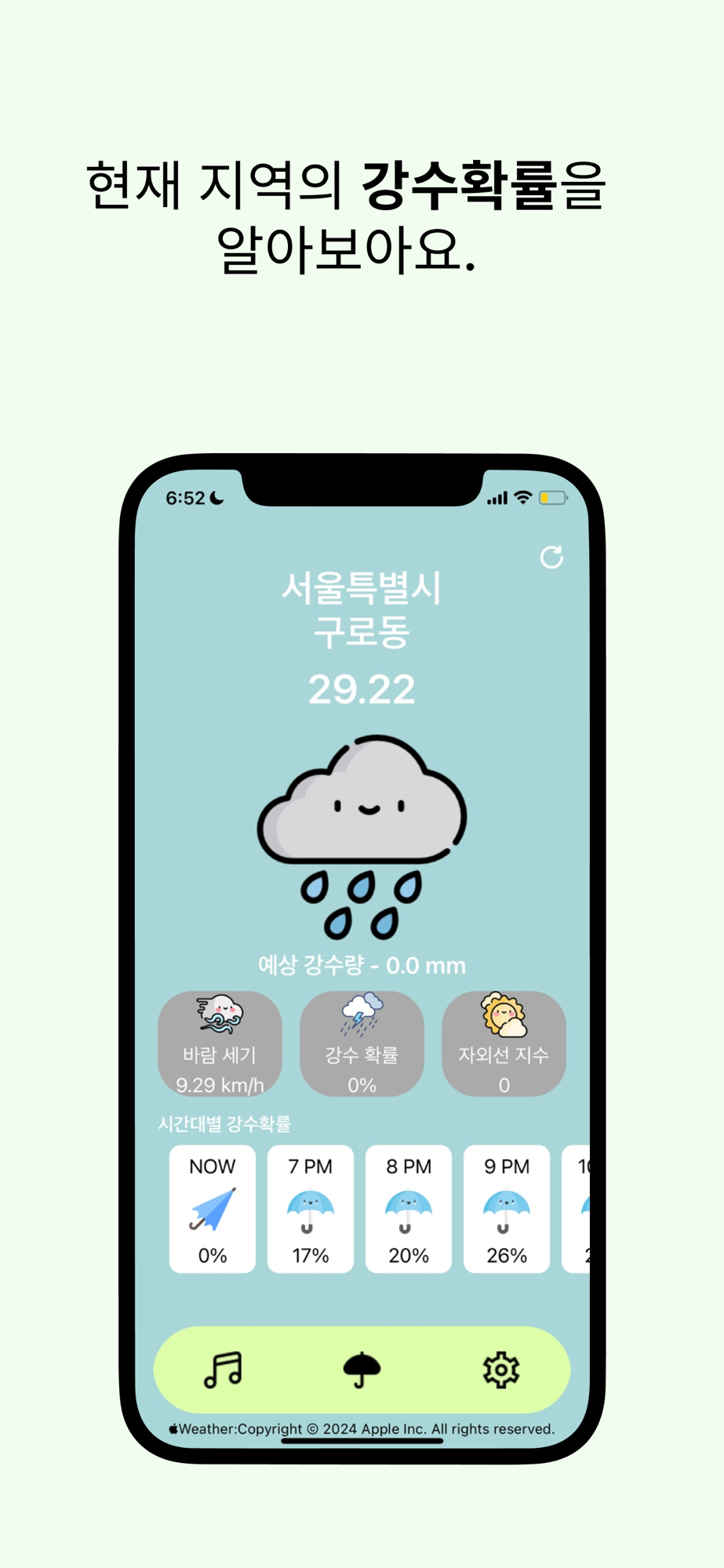 -Apple Co. 에서 제공하는 Weatherkit 현재지역 24시간 강수확률을 통해 언제 우산을 챙겨야할지 미리 대비할 수 있어요.