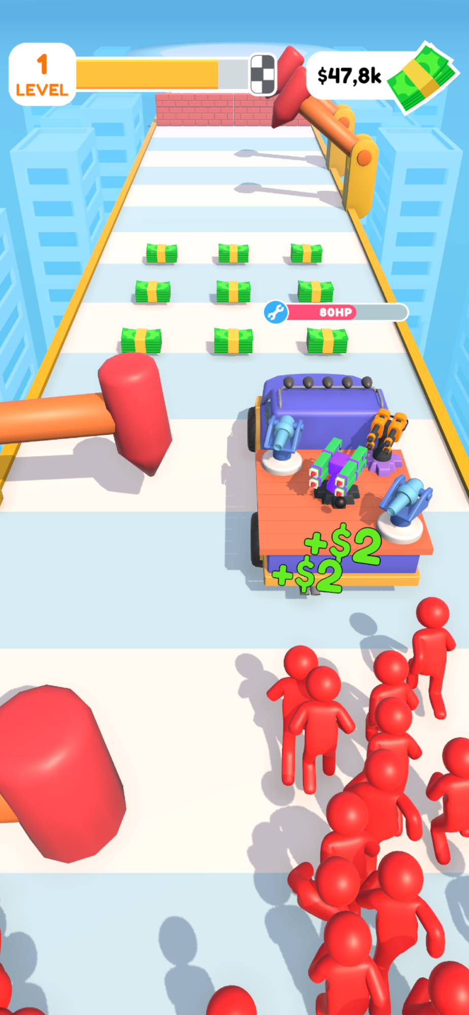 You drive a truck with mounted guns that you can merge to unlock new ones. Your goal is to survive and reach the finish line while avoiding enemy attacks and obstacles that can damage your truck. Can you make it to the end and become the ultimate Defence Runner?