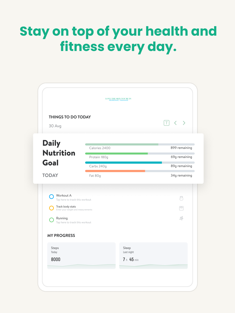 With the Love The Skin You're In App, you will have access to workout programs designed specifically to help you reach your fitness and health goals! You can follow & track your workouts, your lifestyle habits, meal tracking and measurements and results–all with the help of your coach.