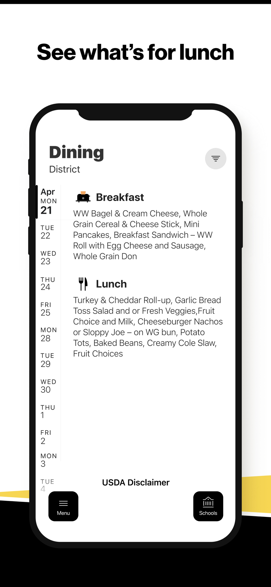 Within the dining section, you'll find an easy to navigate, weekly menu, sorted by day and meal type.