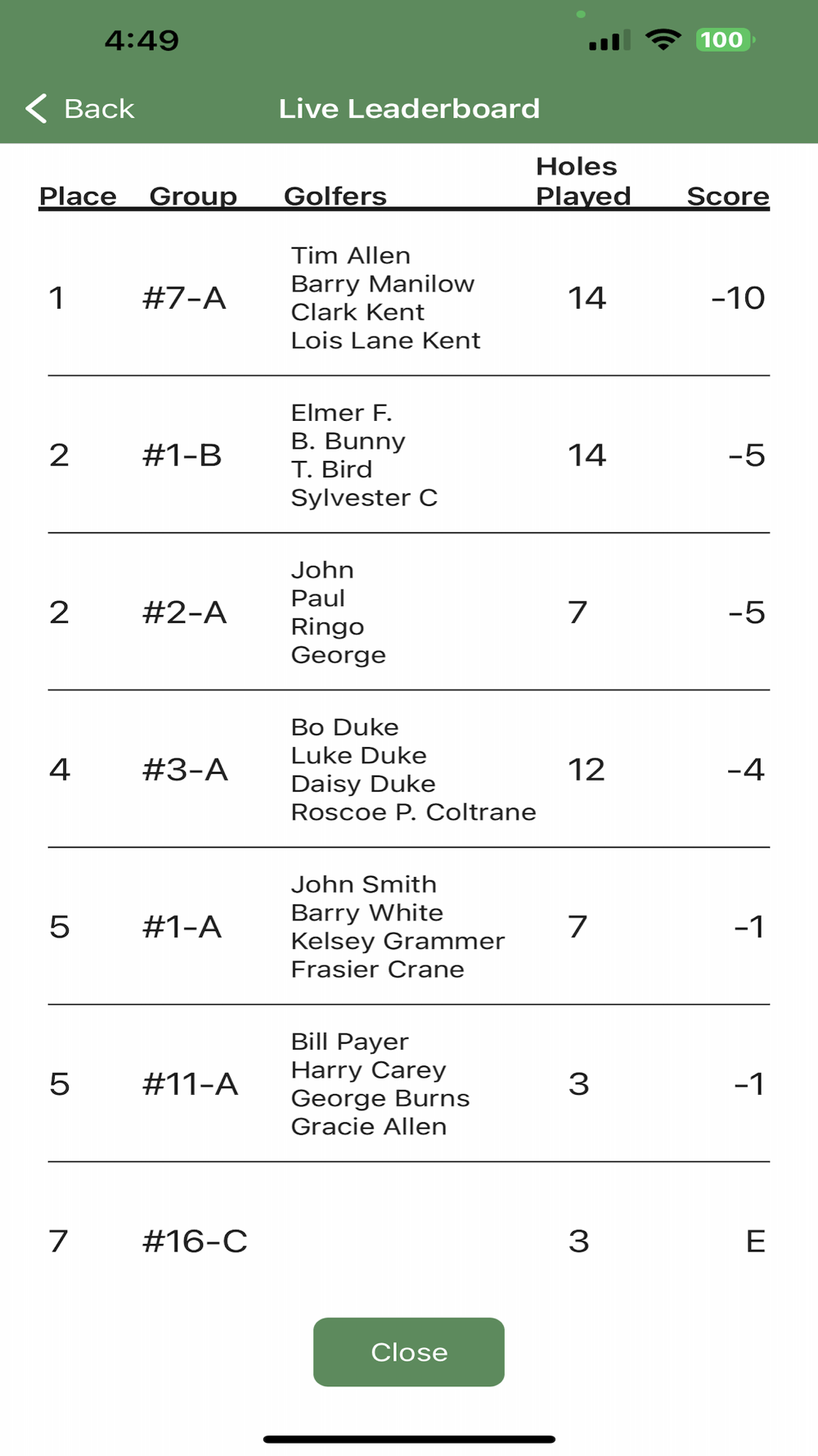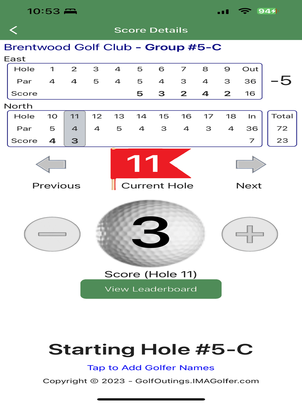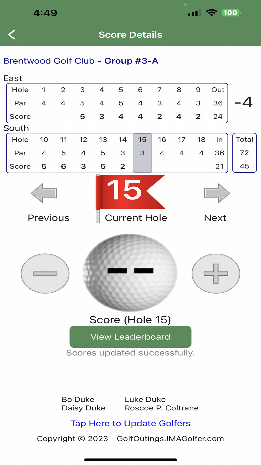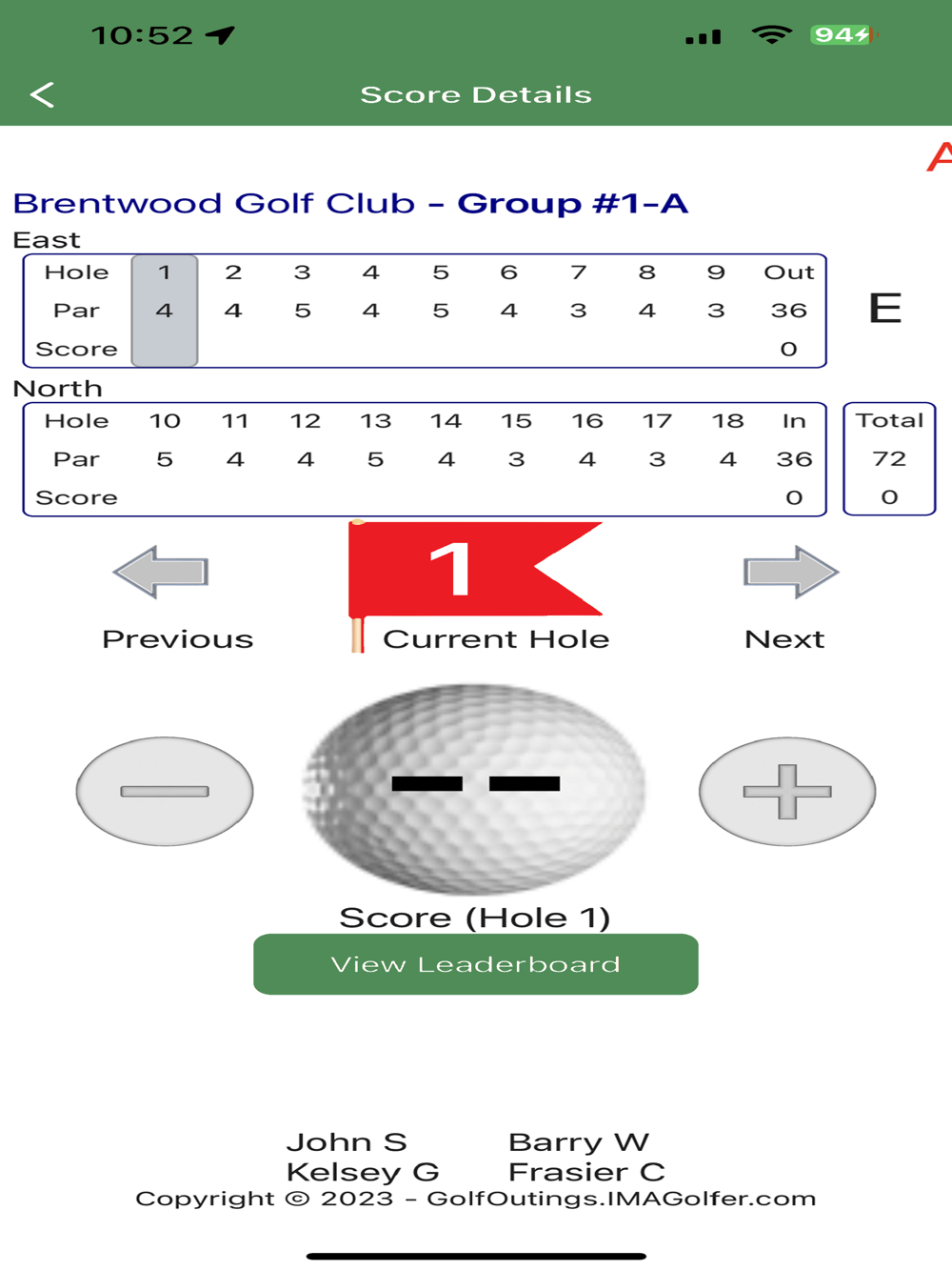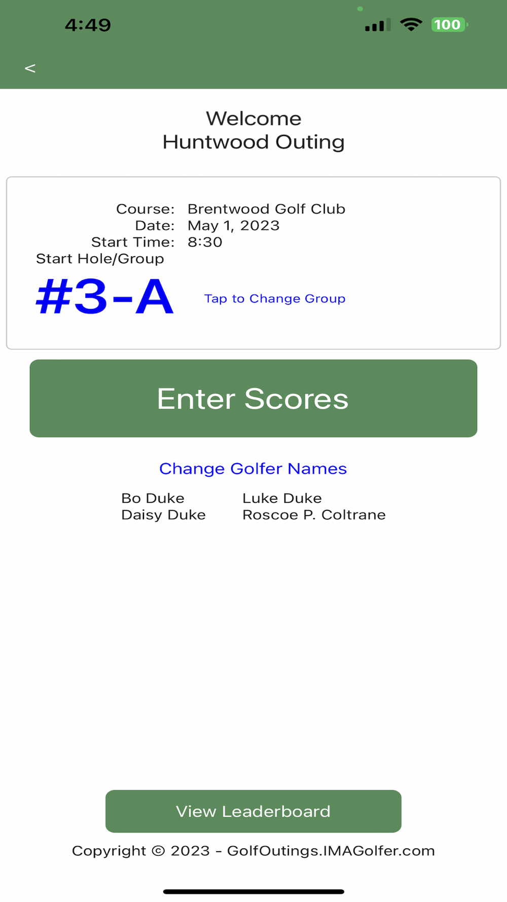 One golfer from each foursome simply selects their foursome from a list and begins entering scores as they play.  The leaderboard is continuously updated during the round, and when everyone's done, the leaderboard is ready and complete.