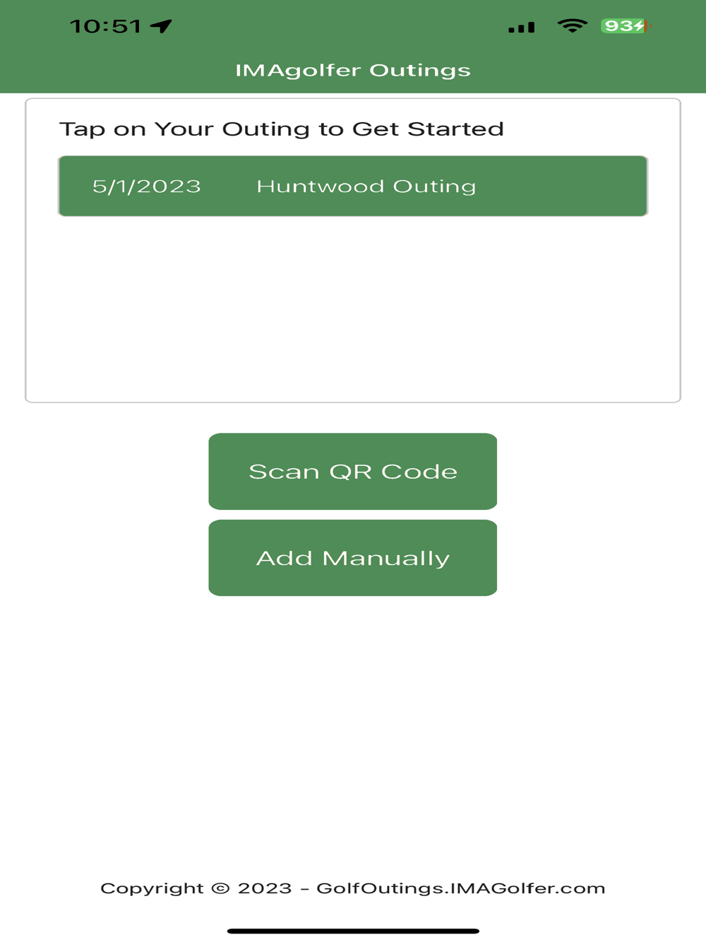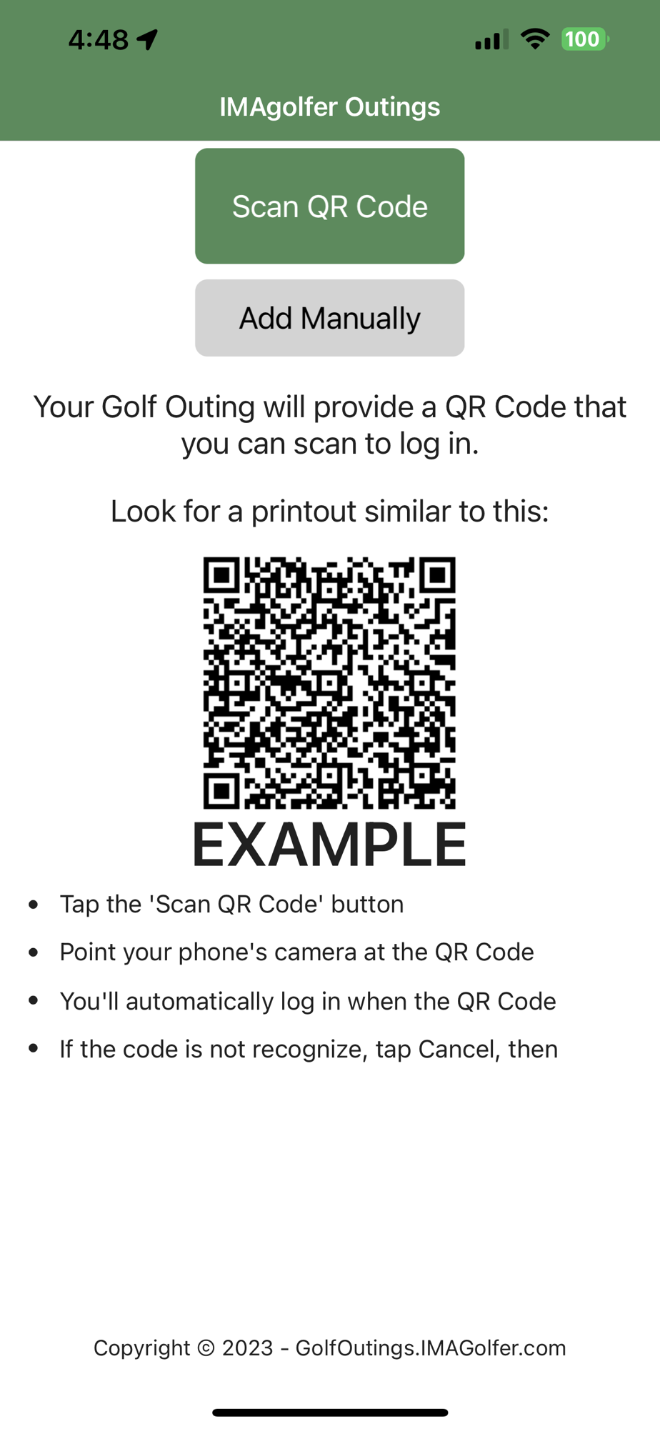 Setup your outing with us prior to the event.  We will create a QR code specifically for your outing.  When golfers arrive to the outing, they can simply point their phone's camera at the QR code to install the app.  Then within the app, they can use the same QR code to log into your outing.  No usernames or passwords to remember.