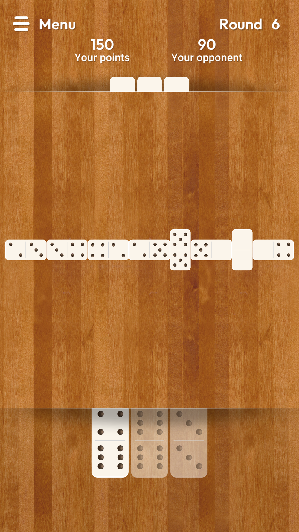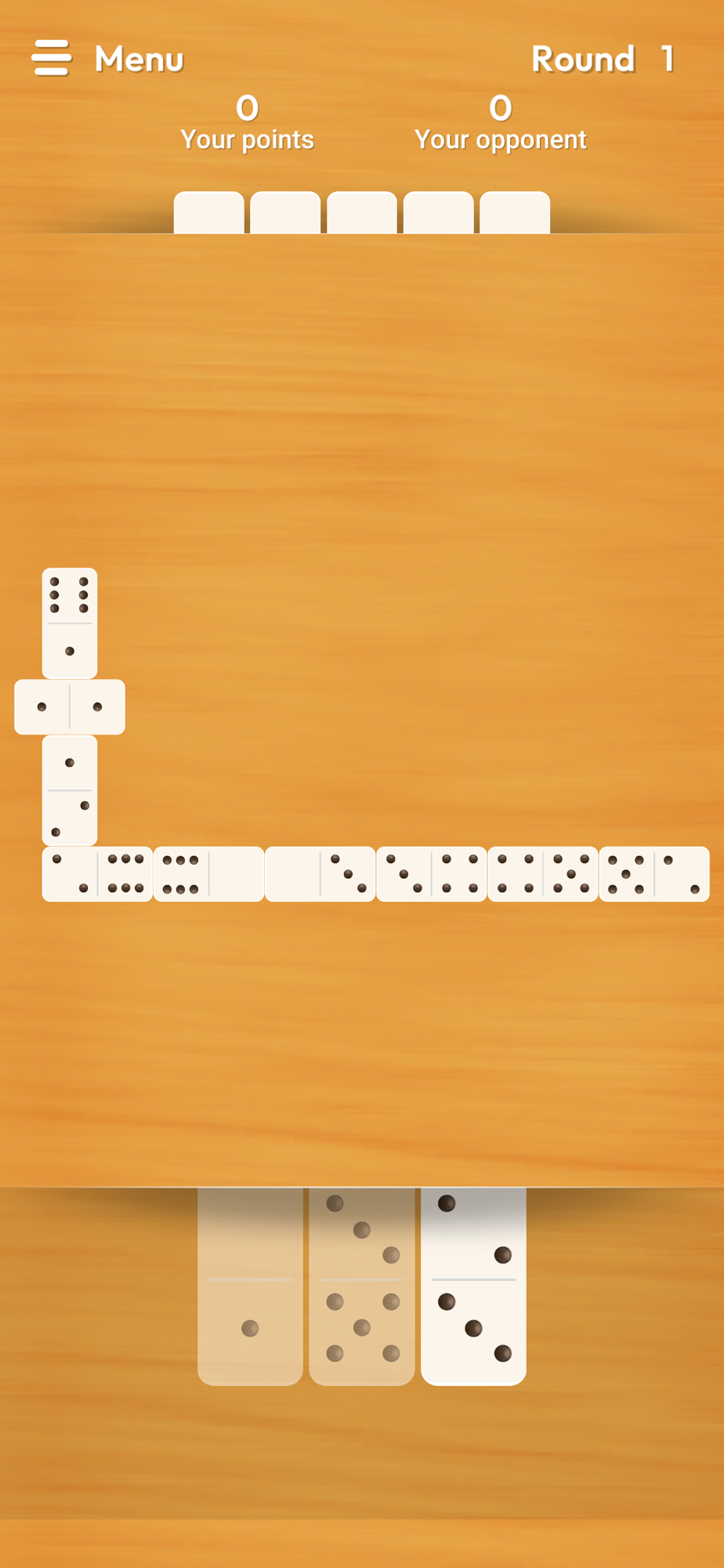 • Dominoes All Fives: slightly more complex. Each turn, you need to add all ends of the board, and count the number of pips on them. If it is a multiple of five, you score those points. A bit difficult at first but you will quickly get it!