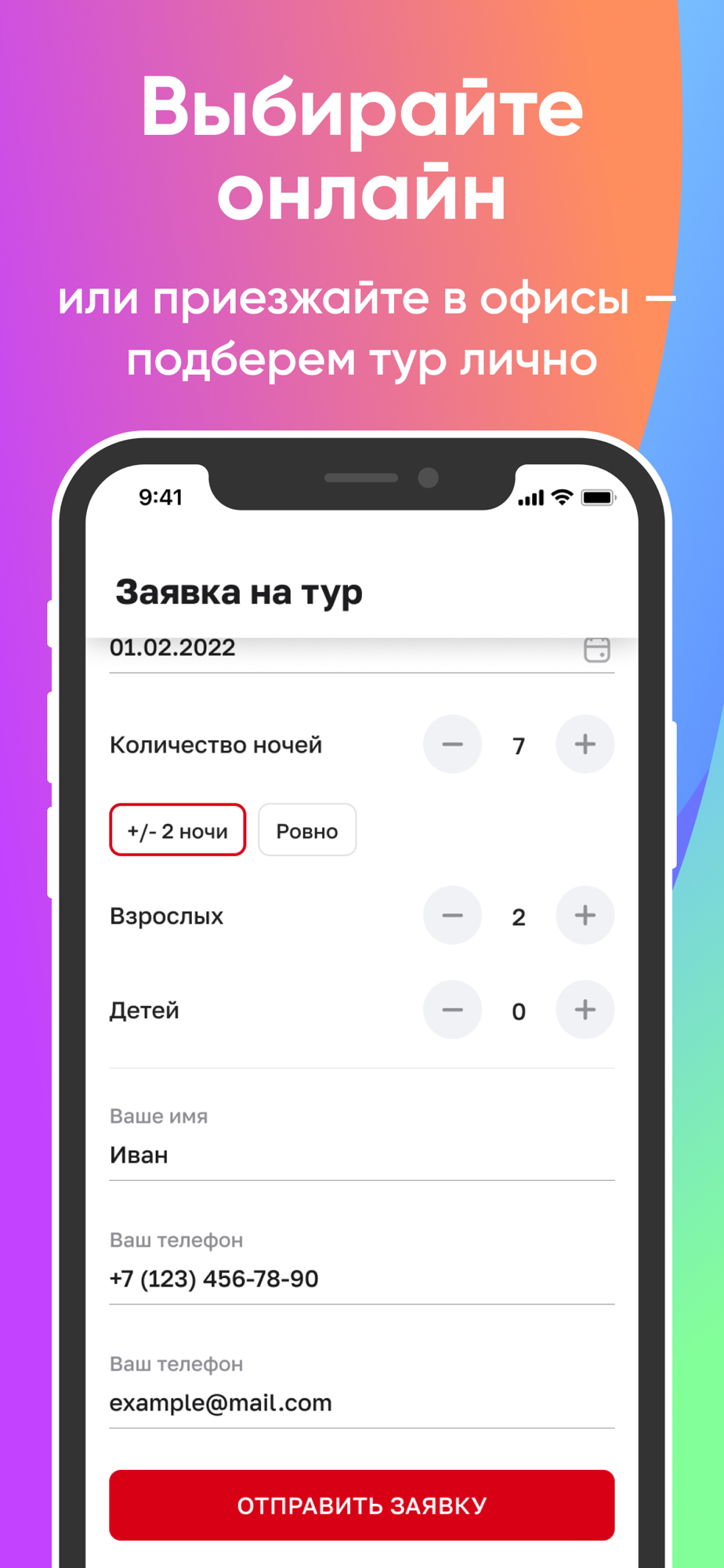 В любое время дня и ночи заходите в приложение, выбирайте направление и бронируйте тур. Без поездок в офисы турагентства и очередей! Мы вышлем все документы на указанную почту, подтвердим необходимые брони и будем на связи 24/7!