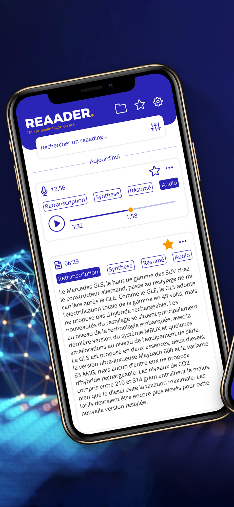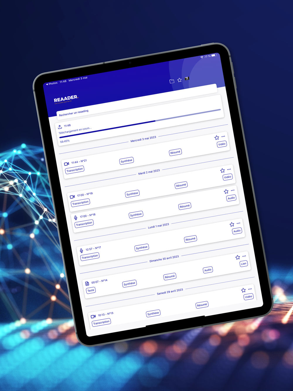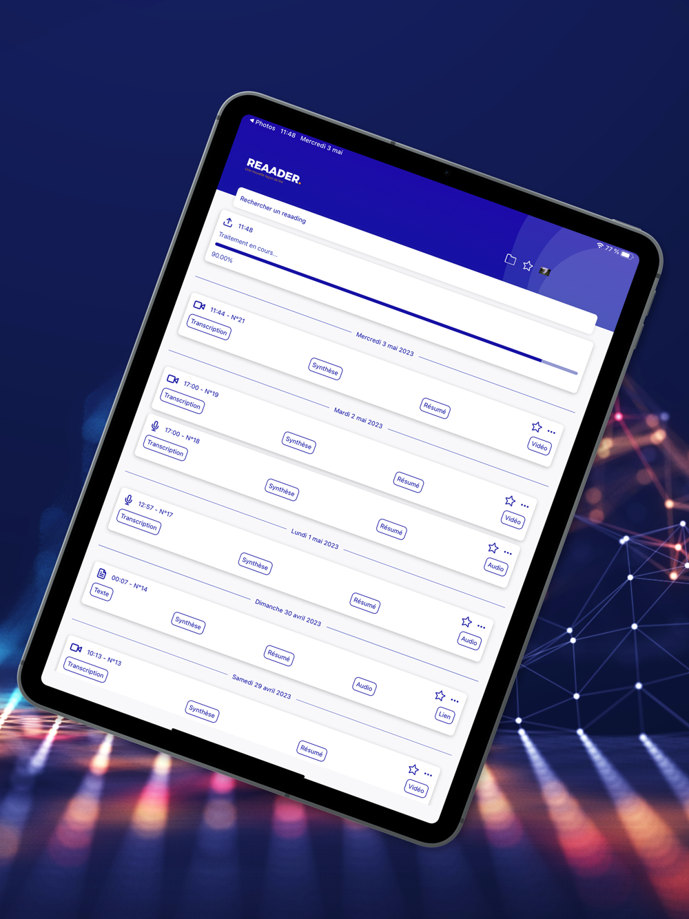 Avec Reaader, vos audios et vidéos vont être transcrites, synthétisées et résumées, vos textes vont être convertis en audio, synthétisés et résumés.