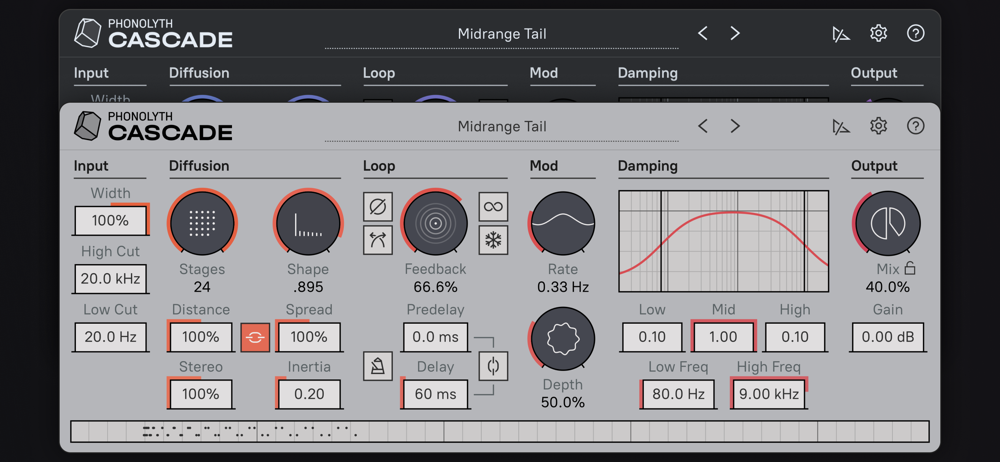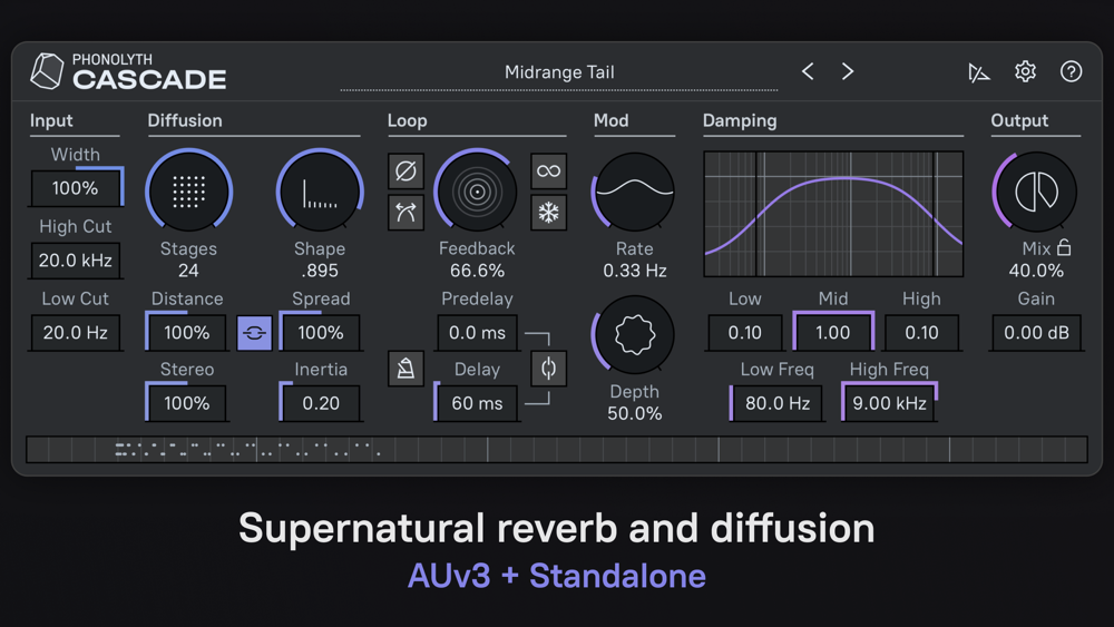 Cascade is a versatile reverb and diffusion processor with an experimental edge. Designed first and foremost with expansive modulated supernatural spaces in mind, it features an extensive set of controls to explore other sonic territories such as stereo widening, transient smearing, hybrid delay/reverb and chorus/flanger/resonator-like effects.