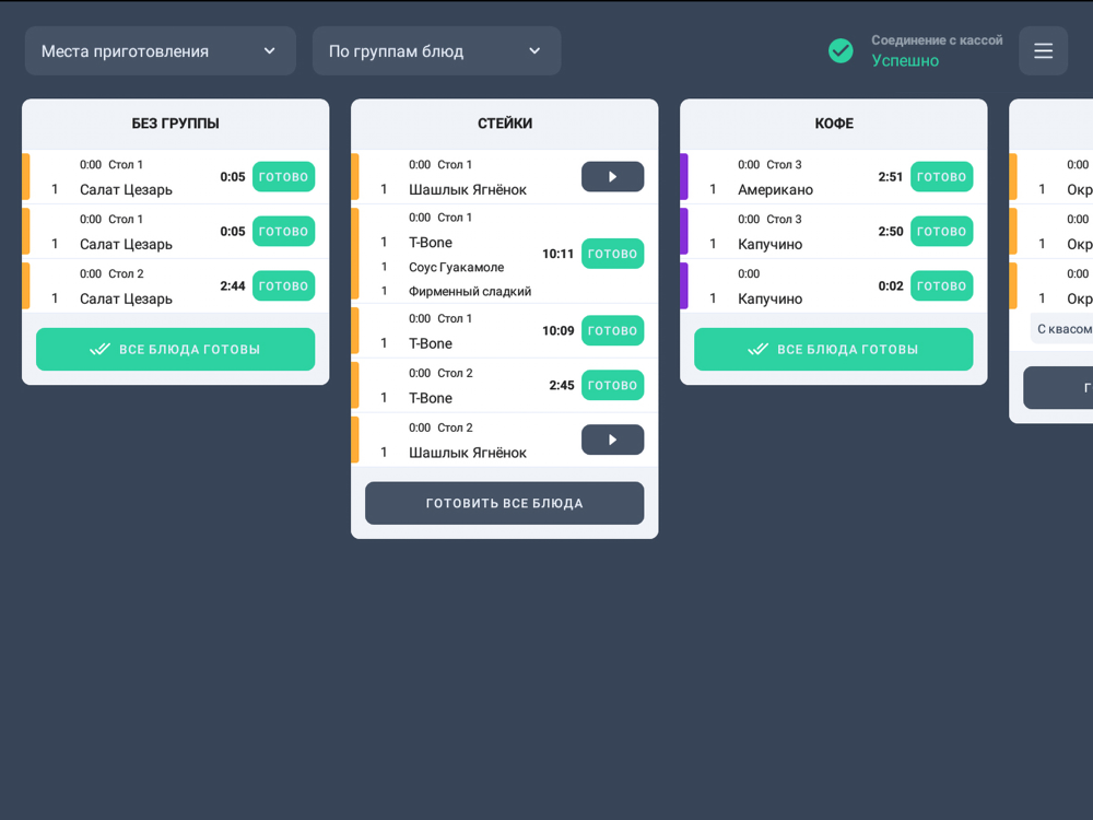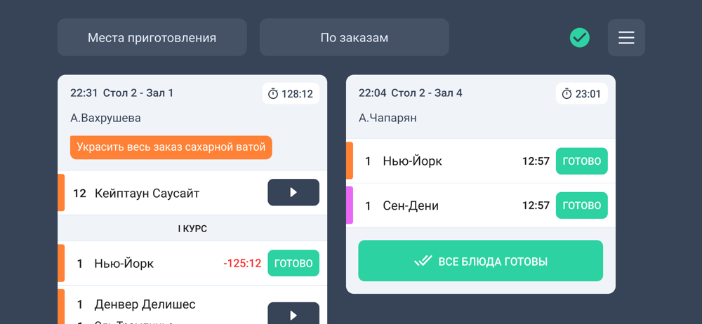 - Уведомление для официанта: когда повар отметит готовность, официант получит звуковое уведомление и увидит статус блюда «Готово».