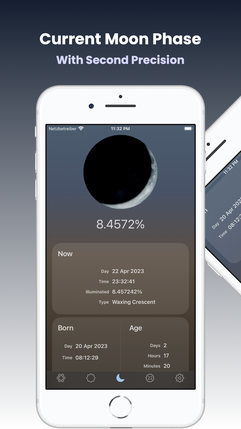 • Current moon phase with second precision.
