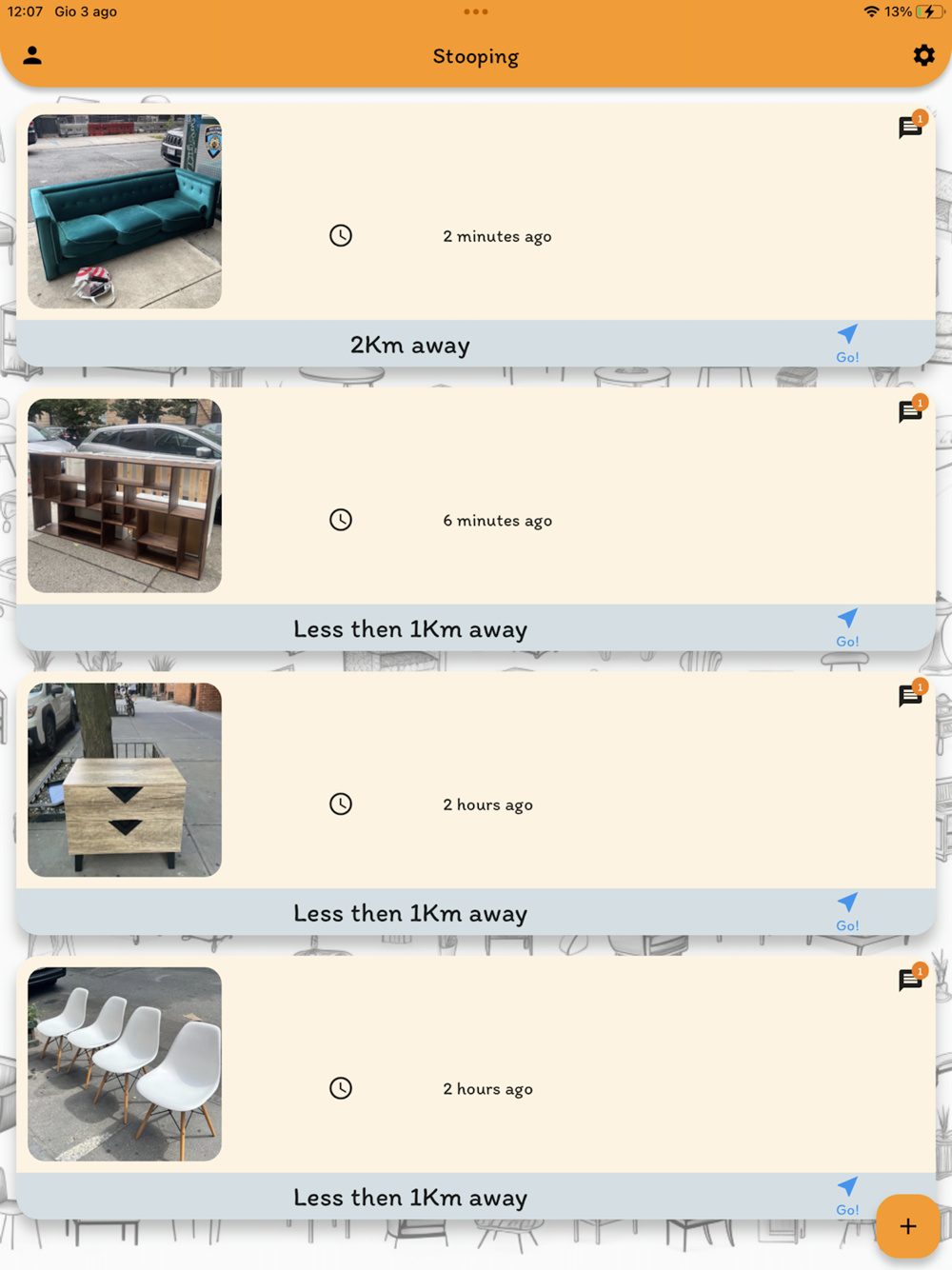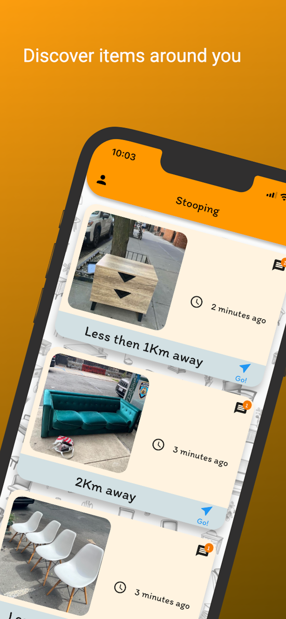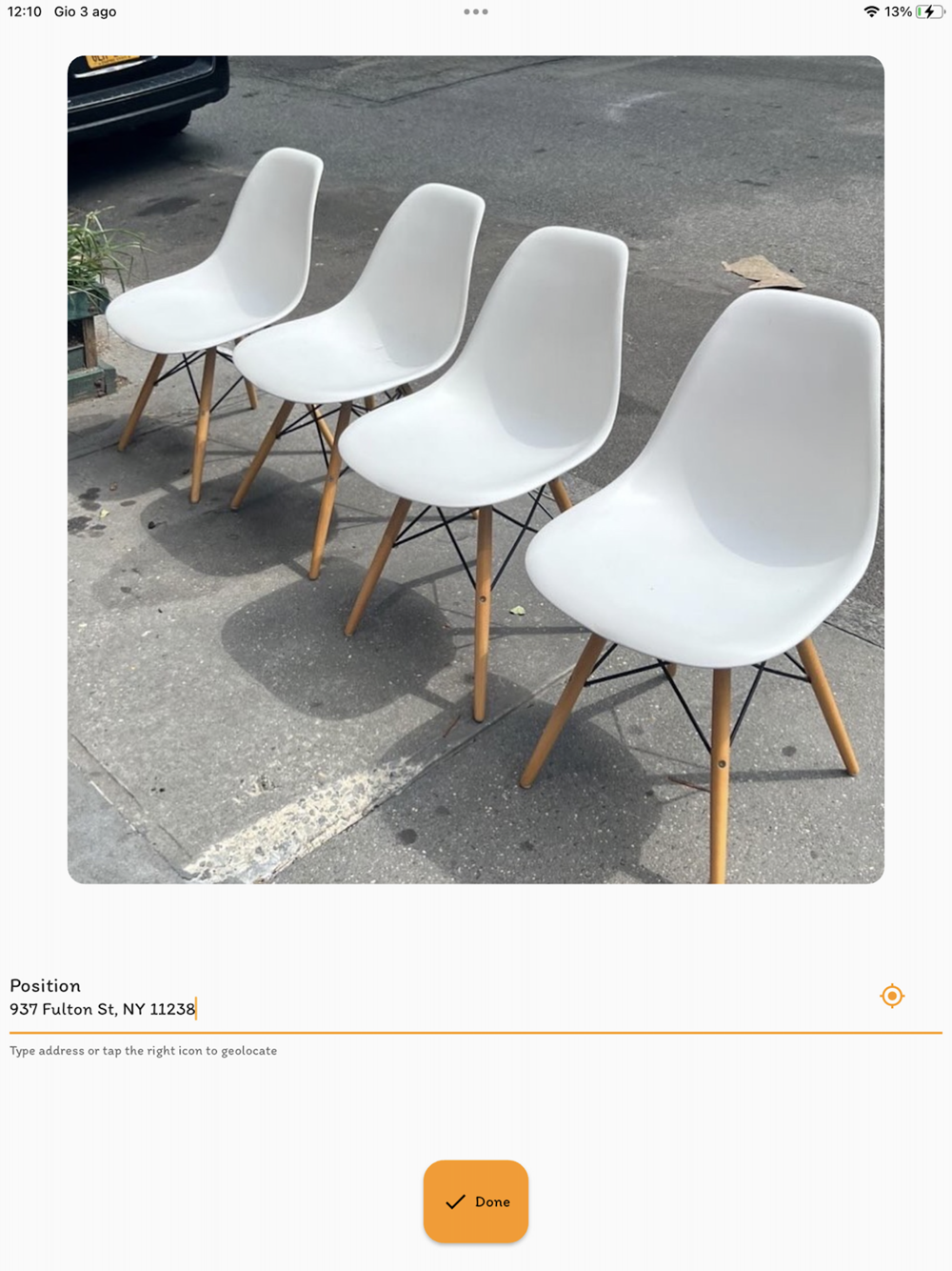 If you spot a piece of furniture left on the street, you can report it via the app. The report includes information such as the photo of the item and its location. This allows other users to be informed abount abandoned furniture opportunities in the area.
