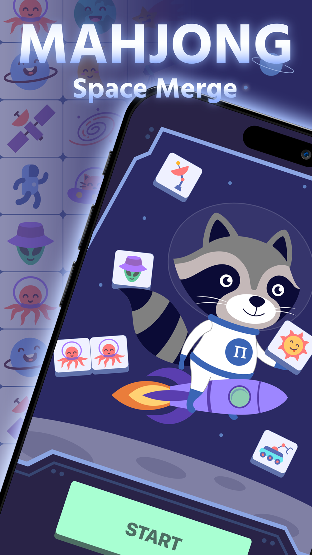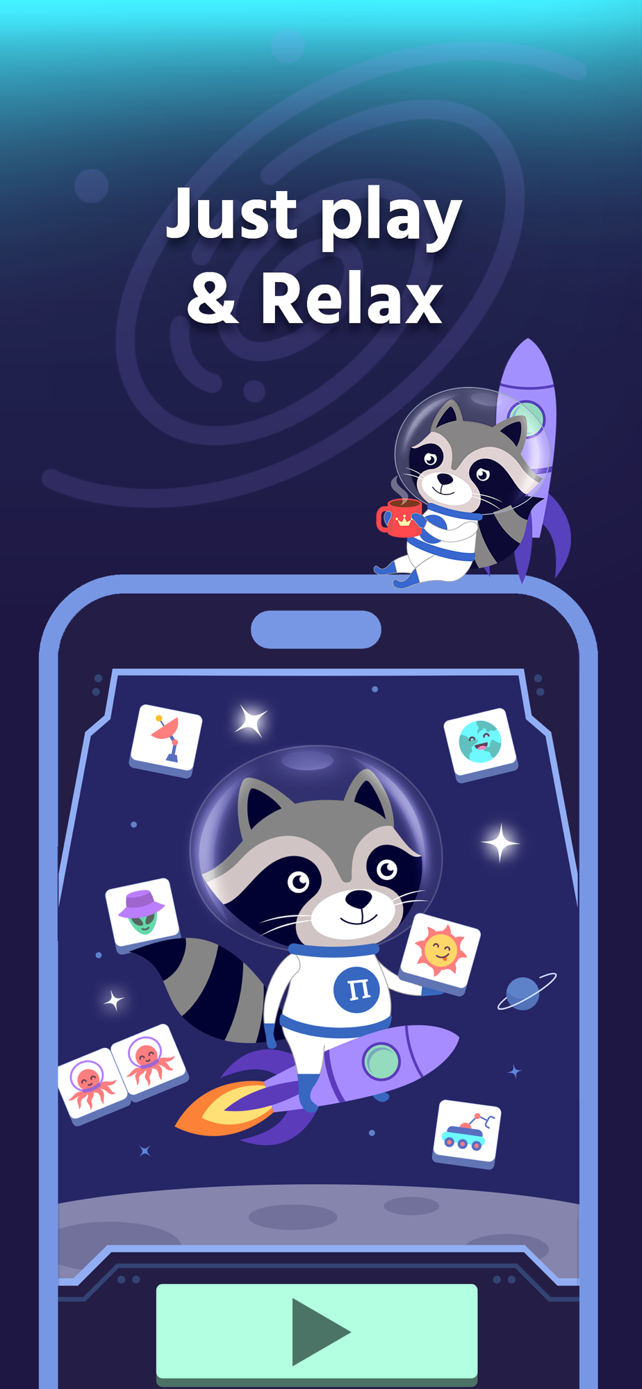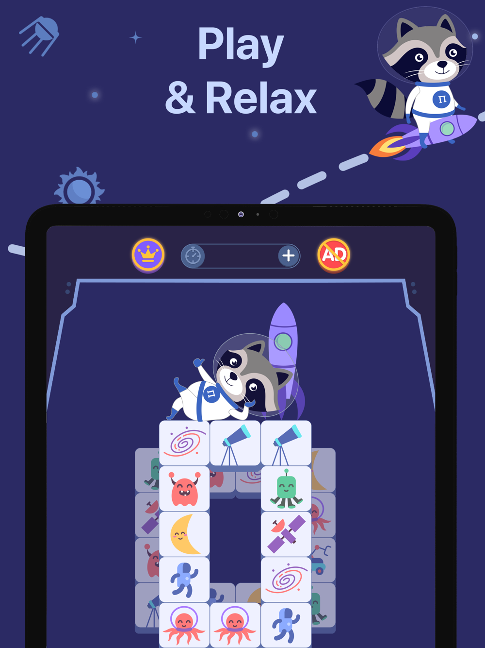 THE RULES are very simple. You need to help the raccoon-astronaut clean Space by collecting 3 tiles of a kind. Similar to match 3 games but with mahjong aspects - searching through many layers of different blocks. The deeper you go harder to play. Use your brain and attentiveness to take all the tiles from Space.