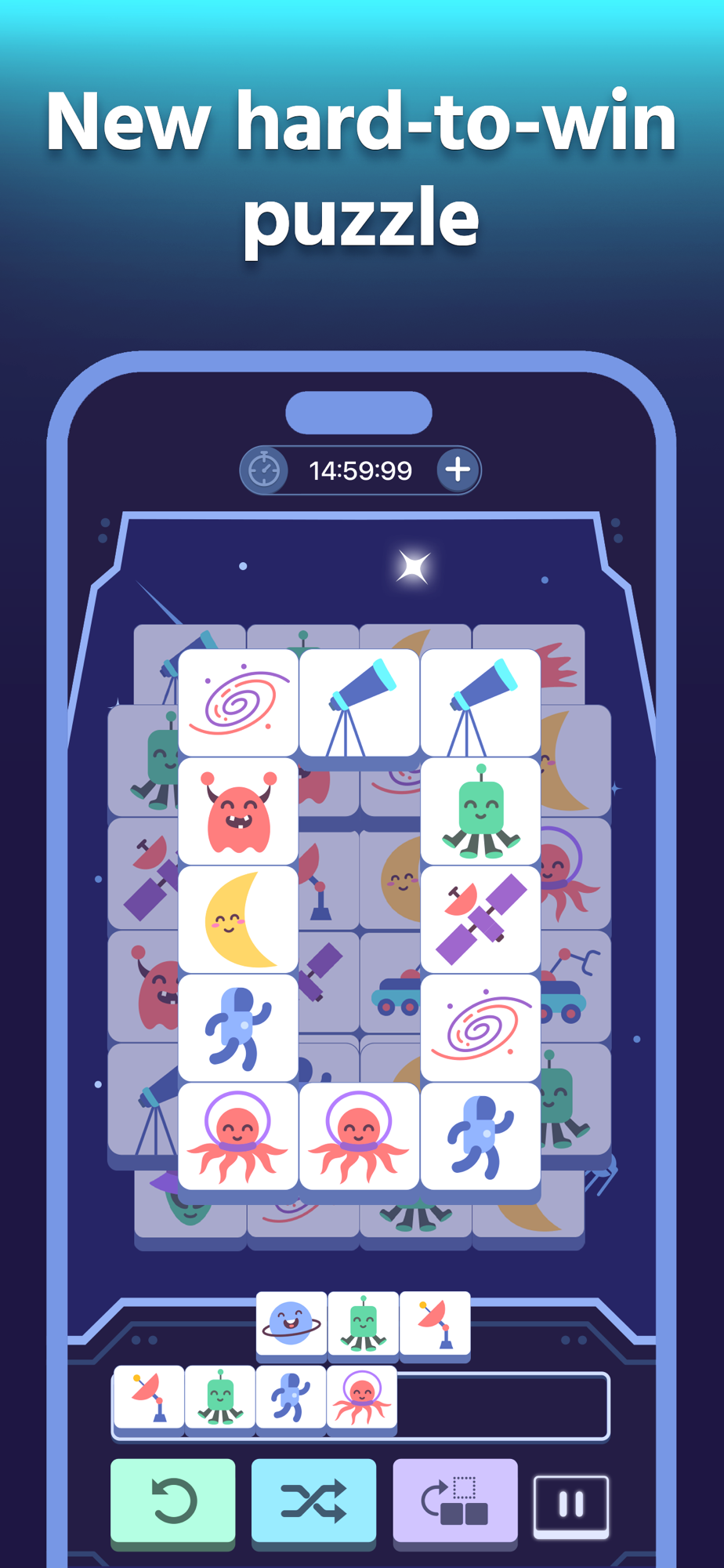 MAHJONG: Space Merge may seem very easy to win but in fact, not every time you will be winning. Actually, there is no one who won the first time he played. Someone can call it the hardest game ever, but with a simple gameplay mode. What else do you need.