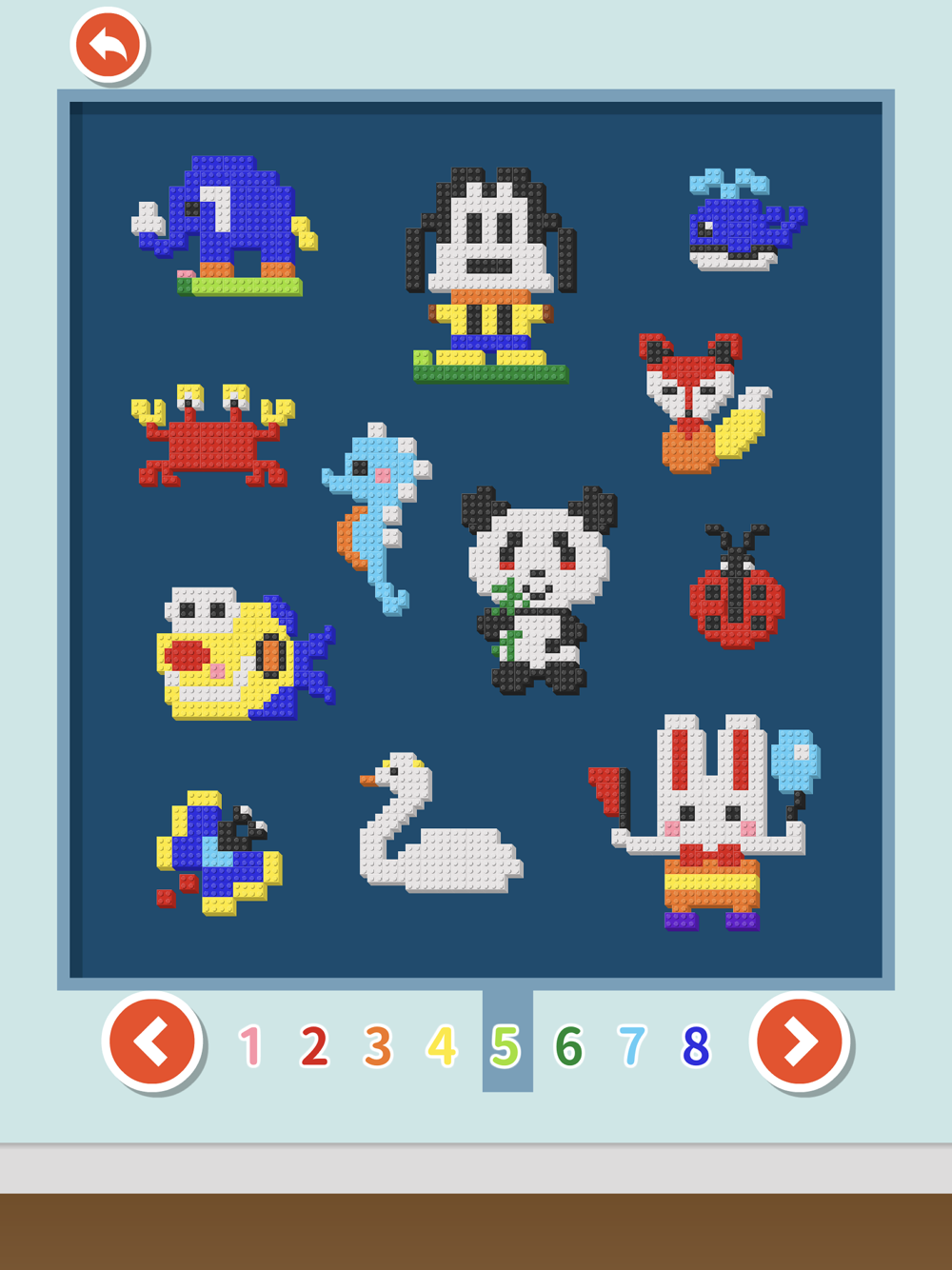 This is an early education game suitable for children to develop their intelligence. It uses various shapes and colors of building blocks to assemble various patterns on the wall, trains hand eye coordination and concentration, recognizes various colors and shapes, and is simple and fun to cultivate children's creativity and imagination.