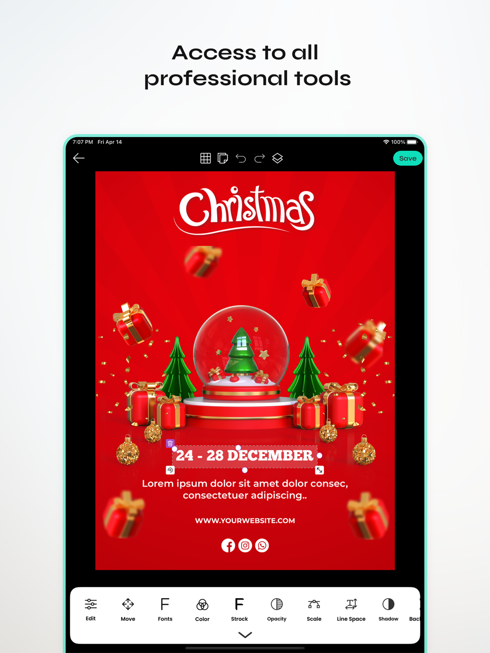 Once you've created your perfect flyer, you can easily save it to your photos and share it on social media platforms like Facebook, WhatsApp, and Instagram with just a tap.