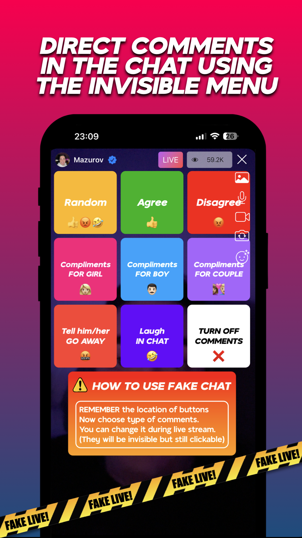 Fake Live also allows you to prank your friends and record their reactions to your stream with an inconspicuous button. And with the option to choose a language for comments, you can adapt your stream to any audience.