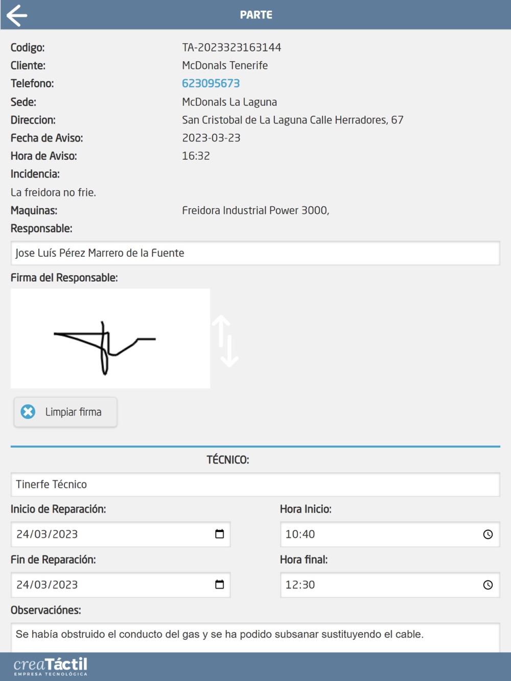 Registro de partes de mantenimiento y reparación: Los usuarios pueden registrar y crear partes de mantenimiento y reparación, ingresando la información relevante, como la descripción del trabajo realizado, la fecha, el equipo o maquinaria involucrada, el técnico responsable, los materiales utilizados y las horas de trabajo.