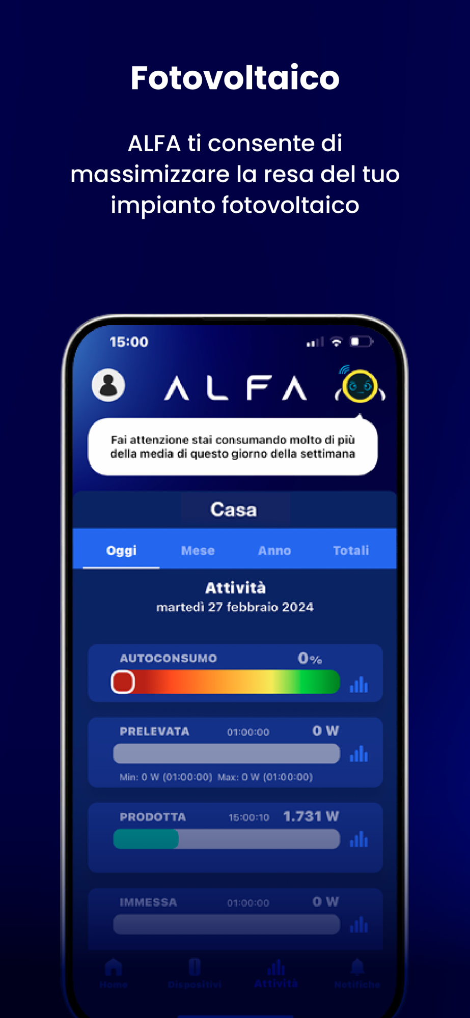 MONITORAGGIO DEI CONSUMI Avrai la possibilità di monitorare in tempo reale i tuoi consumi energetici. Attraverso i grafici mensili e annuali potrai consultare lo storico così da avere un’immagine completa anche dei tuoi consumi in periodi diversi. Grazie alla tecnologia di ALFA, potrai anche tenere sotto controllo i dati relativi alla produzione di energia e avere sempre a portata di mano ogni flusso proveniente dal tuo impianto fotovoltaico.