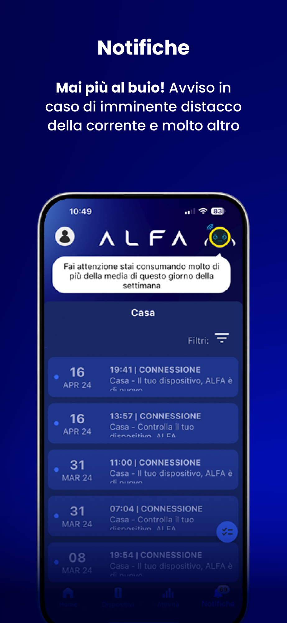 NOTIFICHE Mai più al buio! Oltre ai dati ALFA ti offre anche tutte le altre informazioni che il nuovo contatore mette a disposizione come l’avviso di imminente distacco della corrente e molto altro. Nell’APP è disponibile una sezione dedicata per controllare tutte le notifiche, come per esempio: