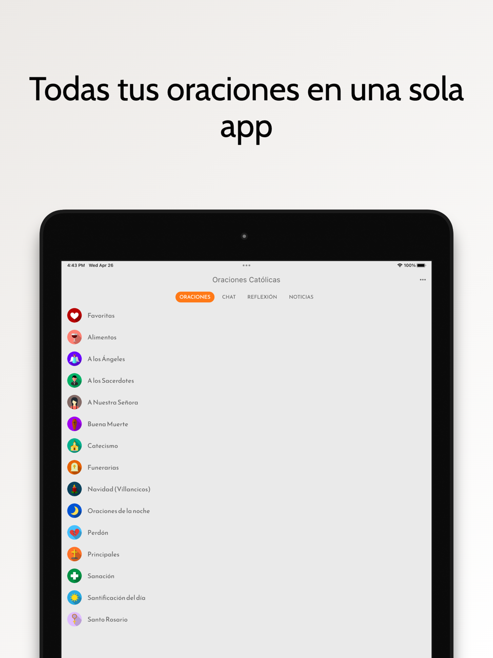 Disfruta de una interfaz de usuario agradable y funcional. Las oraciones están divididas en categorías para que siempre encuentres la que necesites. Además, con la función de Favoritas podrás acceder rápidamente a las oraciones que necesites y compartirlas con tus seres queridos.