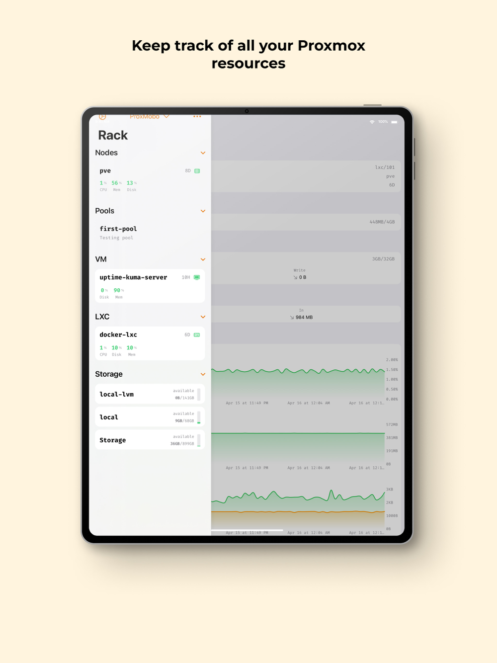 ProxMobo is a powerful third party monitoring and management app for Proxmox. With ProxMobo, you can easily manage VMs and containers all from your iOS device.