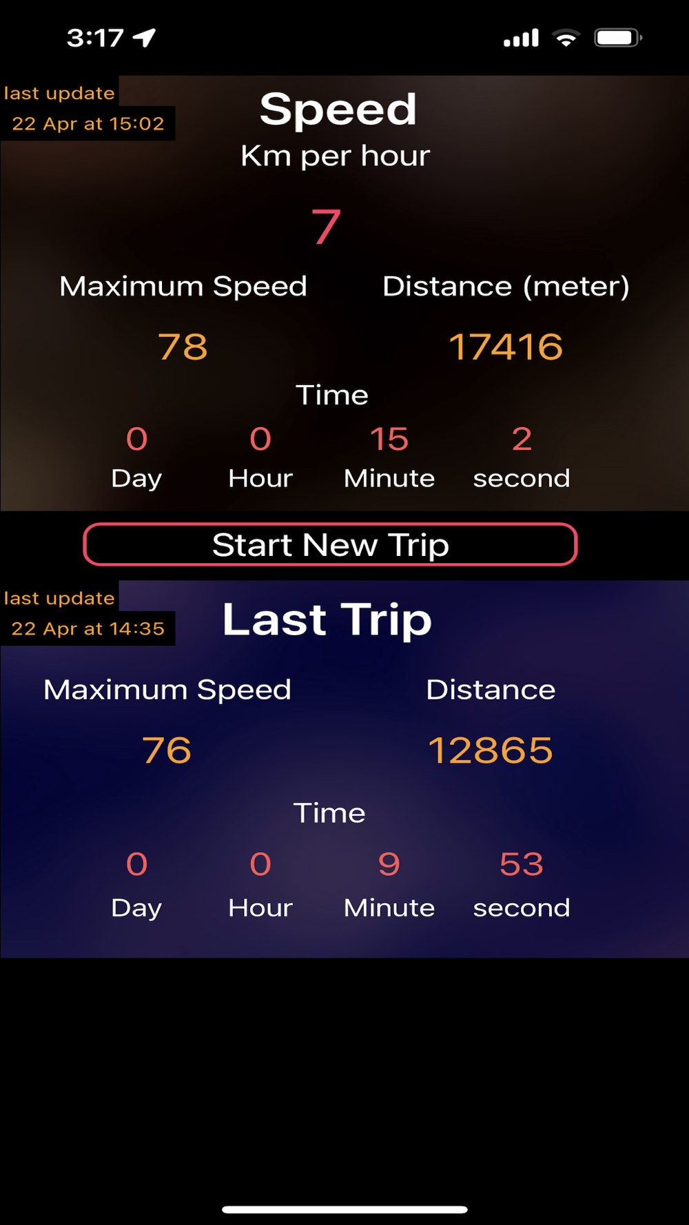Get your Bike, Scooter, walk & car speed while moving in addition to the maximum reached speed during the trip.