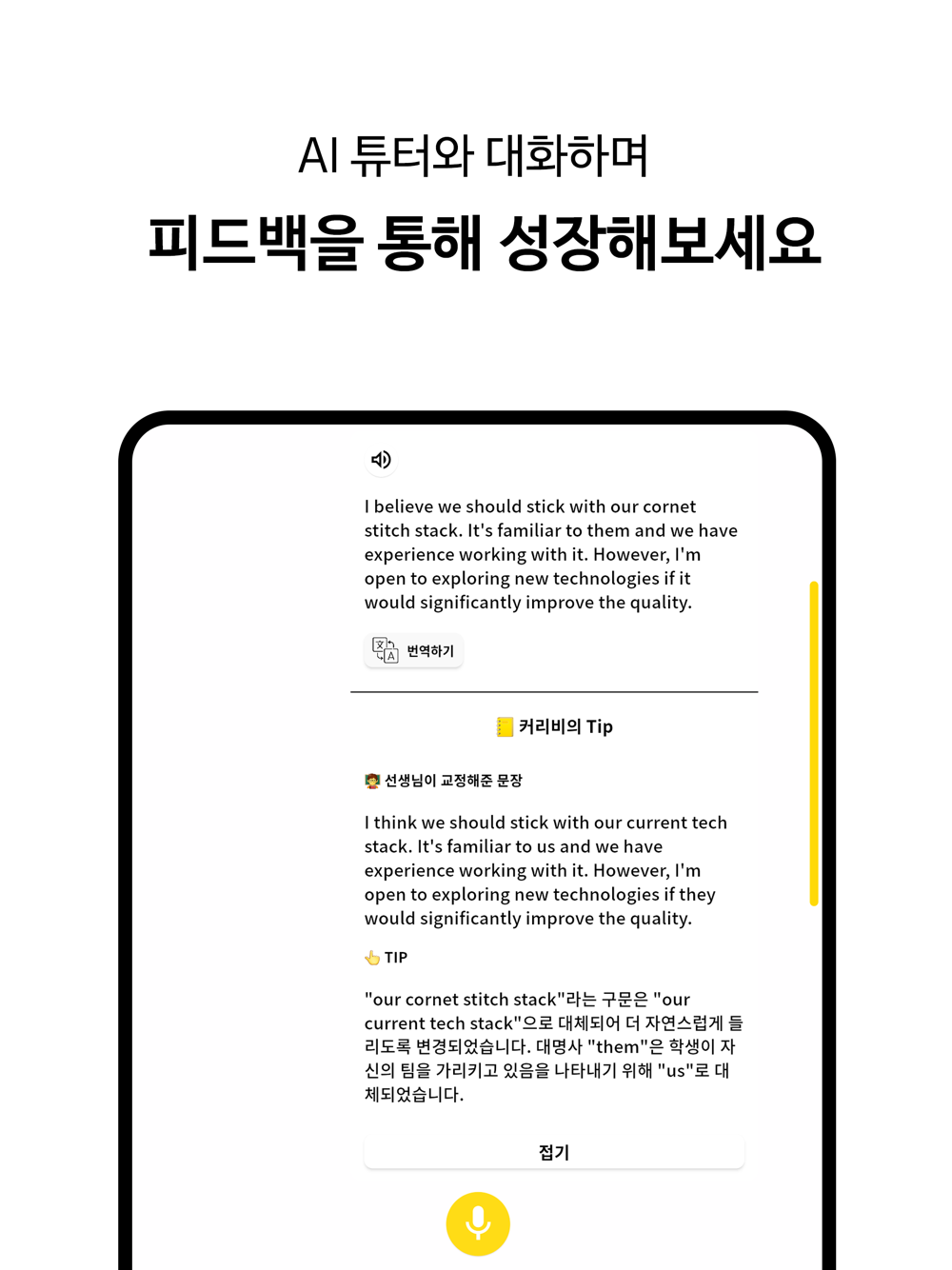 - AI 기반 회화 연습: 자연스러운 영어 회화에 필요한 문법, 어휘, 관용구 및 숙어를 제공합니다.