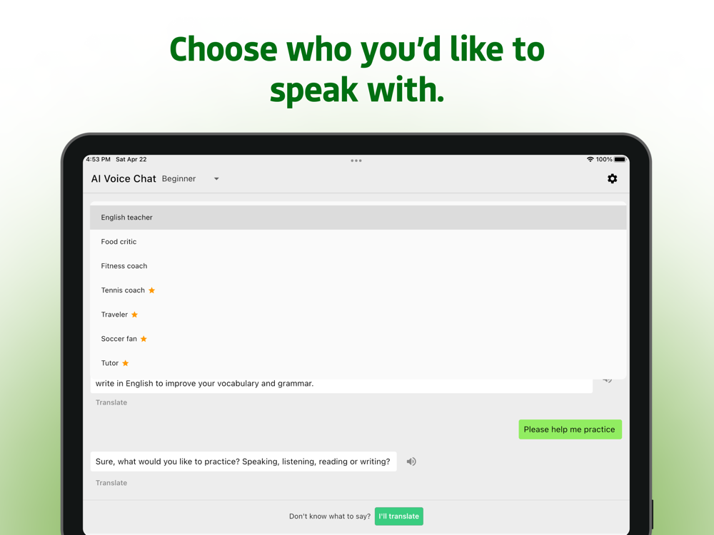 Diverse AI personalities: Choose from a variety of AI personas, including an English teacher, foodie, fitness coach, tennis coach, traveler, soccer fan, and tutor, to practice specific topics and make learning more enjoyable.