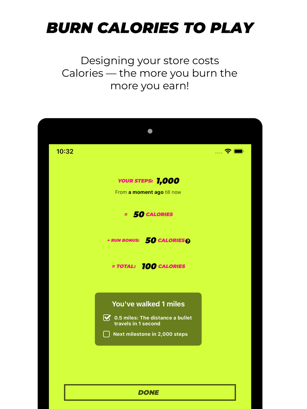 But forget using regular cash. Buying things in this game costs calories — the more you burn the more you can buy. All using your phone's step counter!