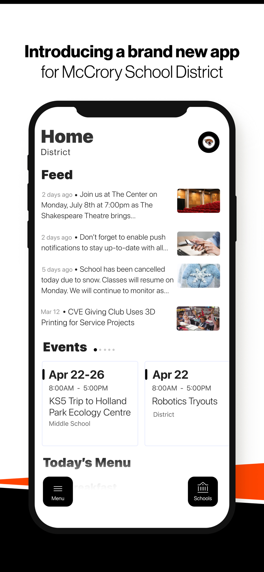 The event section shows a list of events throughout the district. Users can add an event to their calendar to share the event with friends and family with one tap.