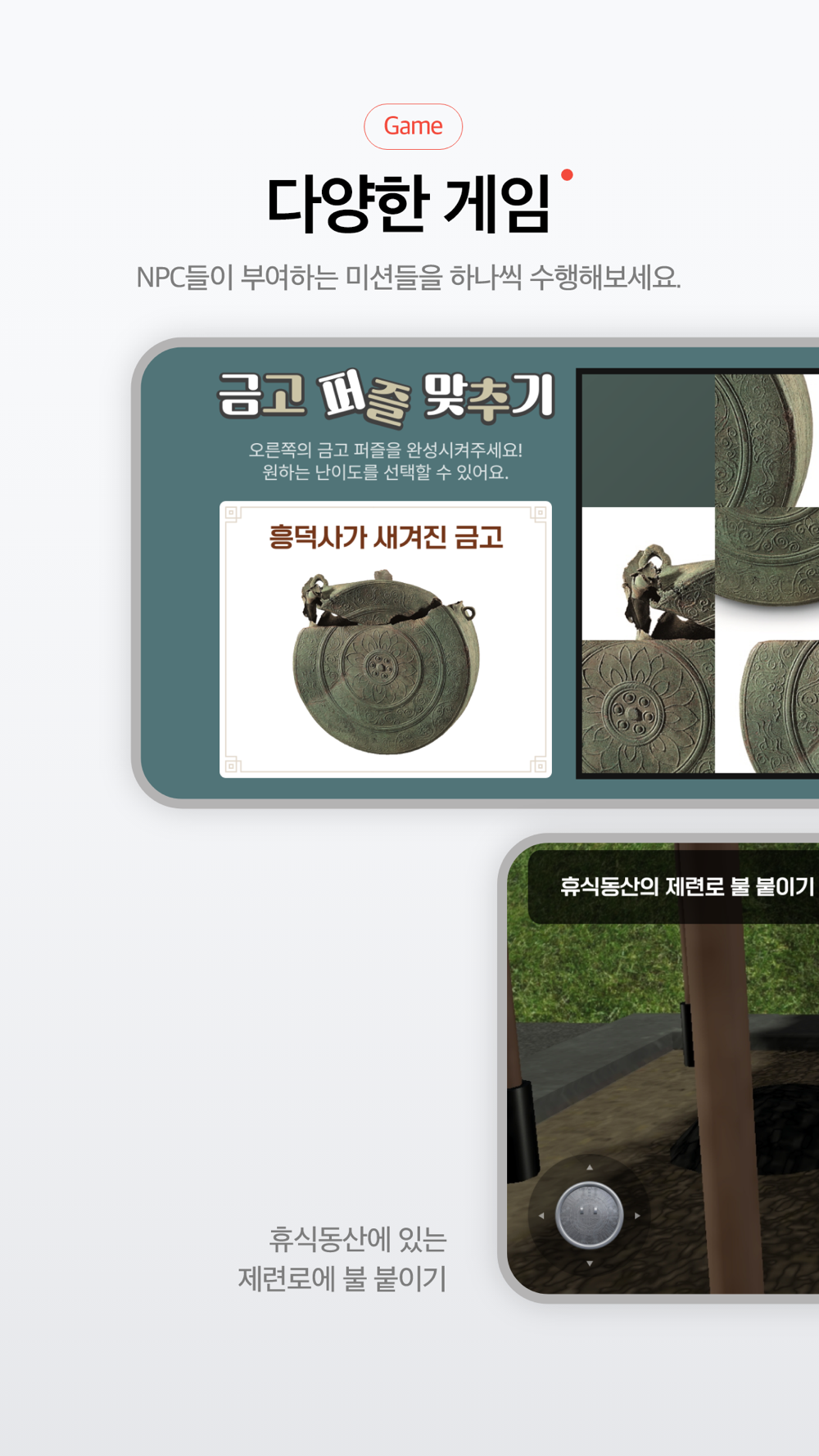 제련로에 불 피우기 등 문화유산과 관련된 미니 게임, AR 게임 등이 준비되어 있습니다.