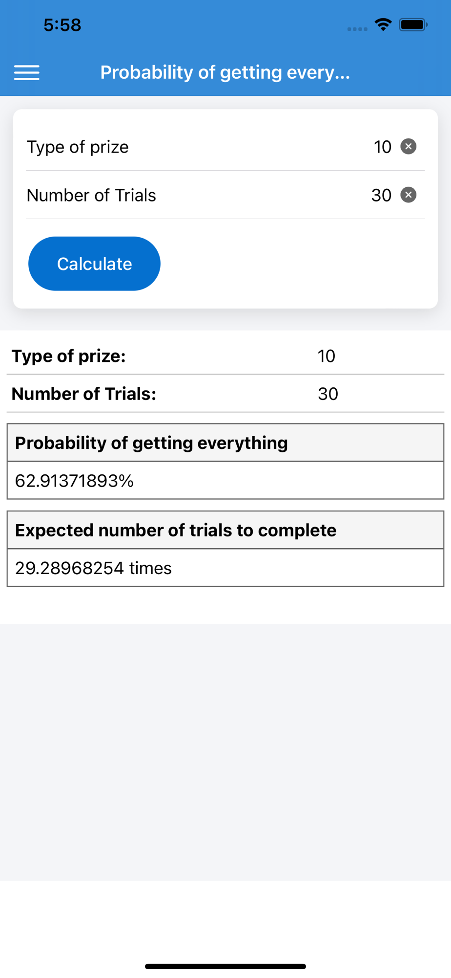 You can easily check the probability of completing the lottery with 10 types of prizes when you draw 30 times.