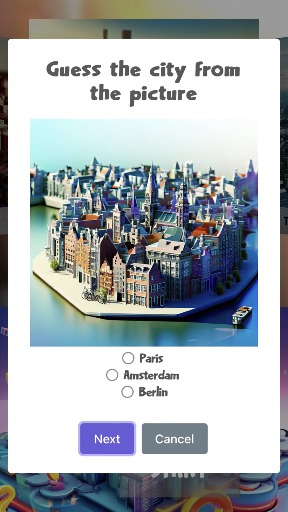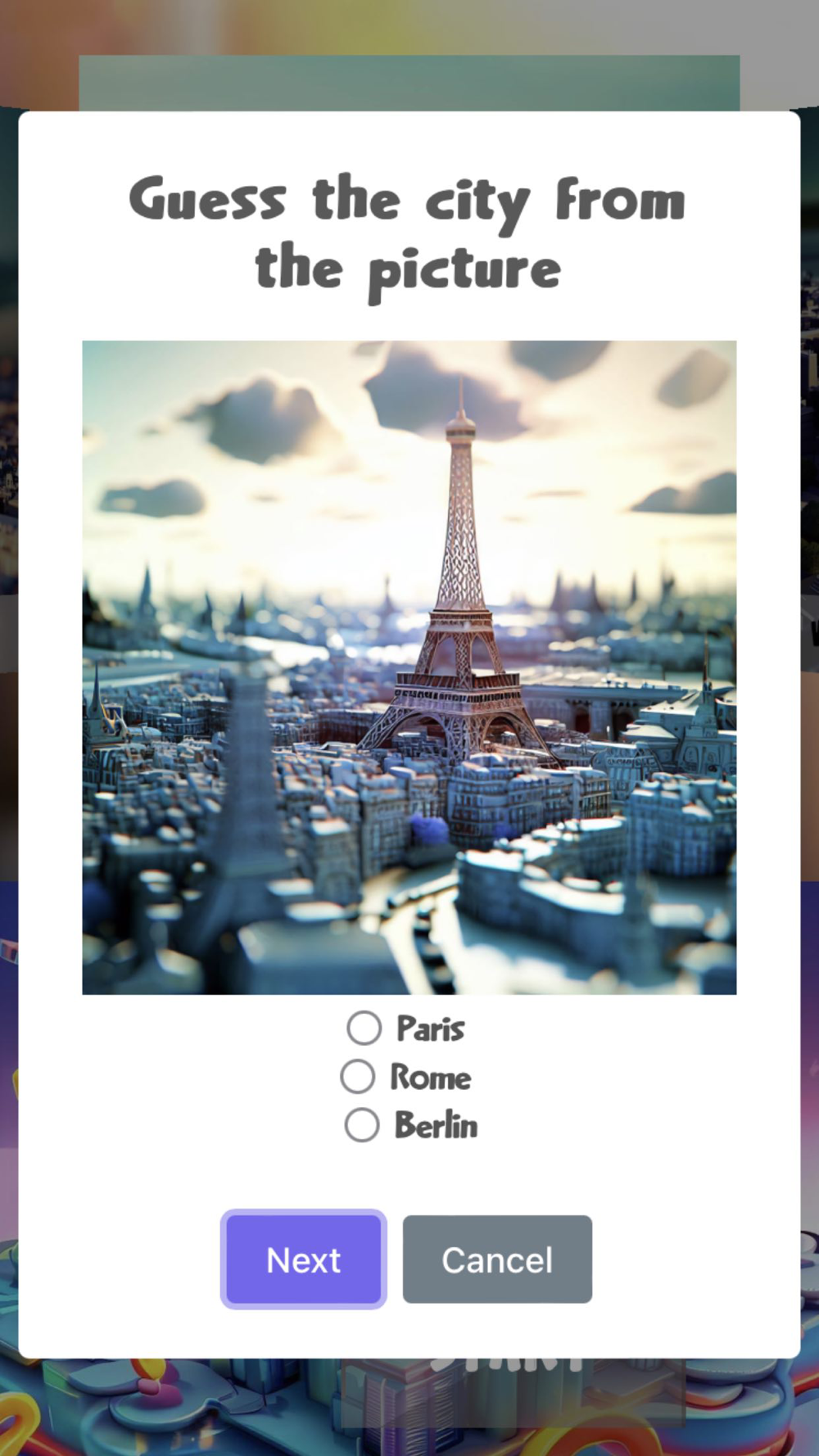 The app also includes tests that allow users to test their knowledge about cities. Each test represents an image of a certain place in the city, and the user must guess which city is depicted in the photo. The tests help users deepen their knowledge about cities and have fun while learning something new.