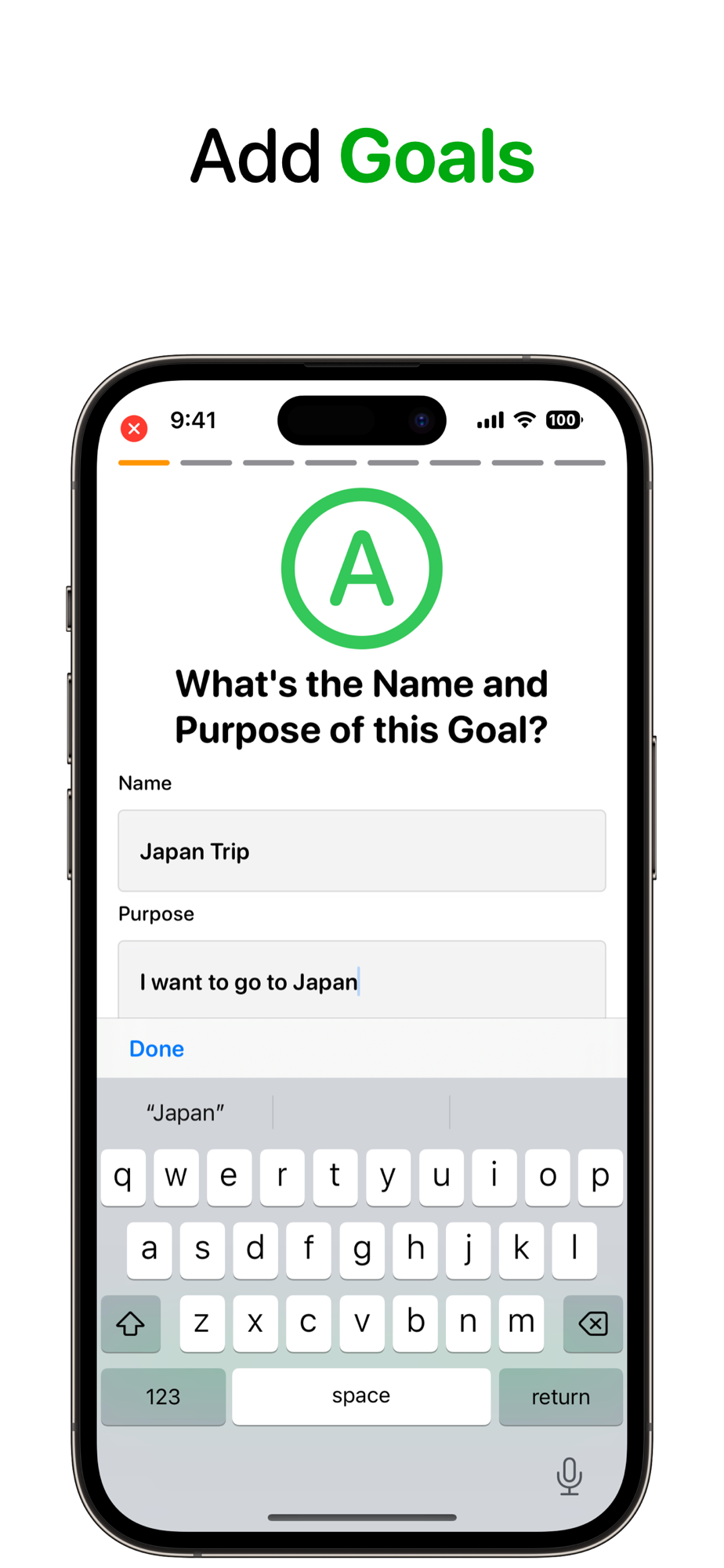 Keywords: financial goals, tracker, personal finances, investments, savings, progress tracking, money goals, intuitive interface, user-friendly, contributions, accounts, mark as completed, view progress widgets, Home Screen, multiple goals, control finances, financial freedom.