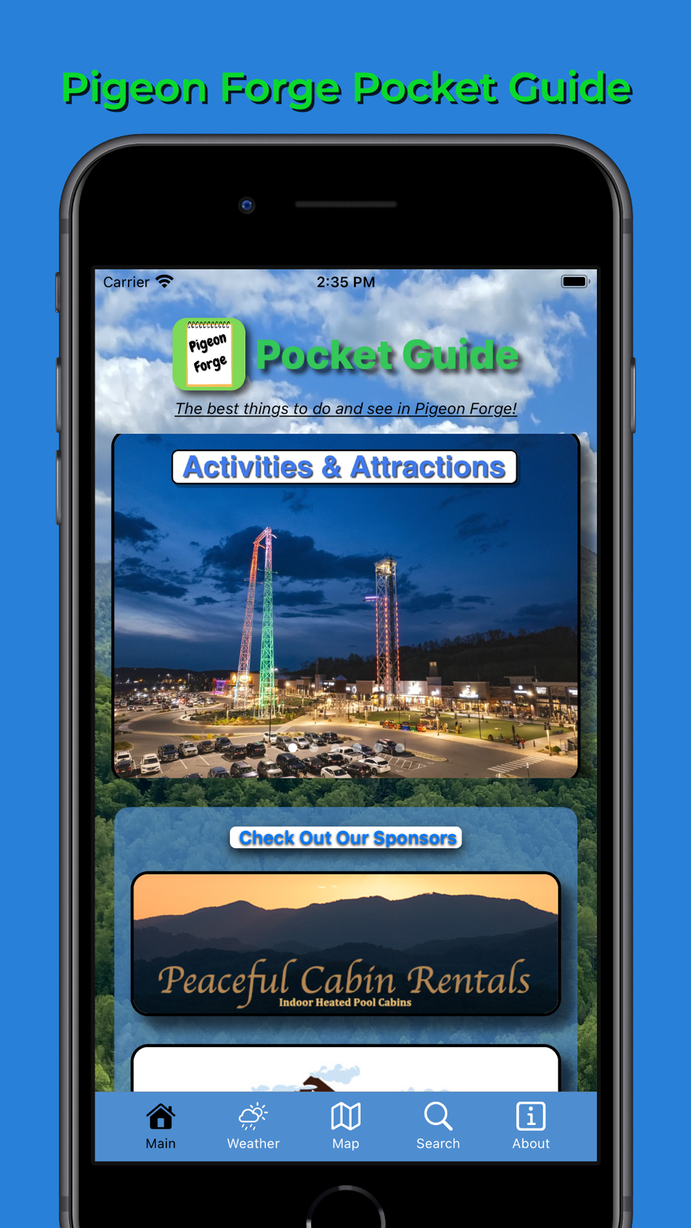 The Pigeon Forge Pocket Guide app is packed with information on all of the main attractions, as well as the smaller, lesser-known venues and attractions. It also includes a search feature that allows you to easily find locations by searching their name, tagline, or description.