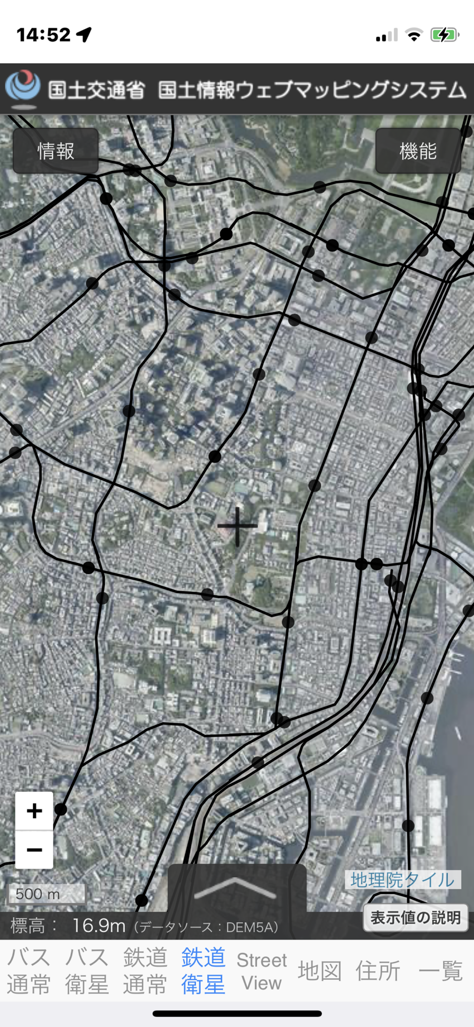 4.[鉄道衛星]は、衛星写真に、駅と鉄道路線を表示します。黒丸が駅で、黒線が鉄道路線です。