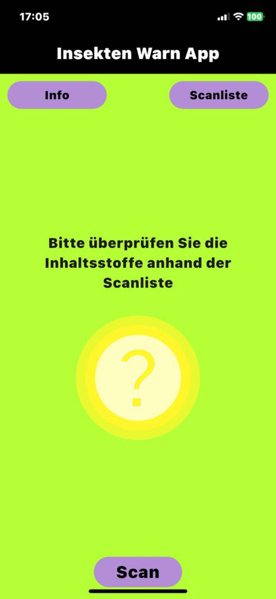 Die App InsektenWarnung scannt den Barcode von Lebensmitteln und zeigt an ob diese Insekten oder deren Bestandteile enthalten. Die App ist schlicht und einfach in der Anwendung. Bei dem drücken auf den "Scan" Button öffnet sich die Kamera sodass der Barcode von Lebensmitteln gescannt werden kann. Die EAN-Nummer wird dann an die OpenFoodFacts Datenbank gesendet. Nach dem scannen wird sofort angezeigt ob das Produkt Insekten enthält oder nicht. Wenn das Produkt nicht gefunden wird kann der Benutzer die Inhaltsstoffe auf der Rückseite des Produkts anhand der "Scanliste" überprüfen. In der Scanliste sind die Namen und Bezeichnungen der Insekten sowie deren Bestandteile aufgelistet um so die manuelle Überprüfung zu unterstützen.