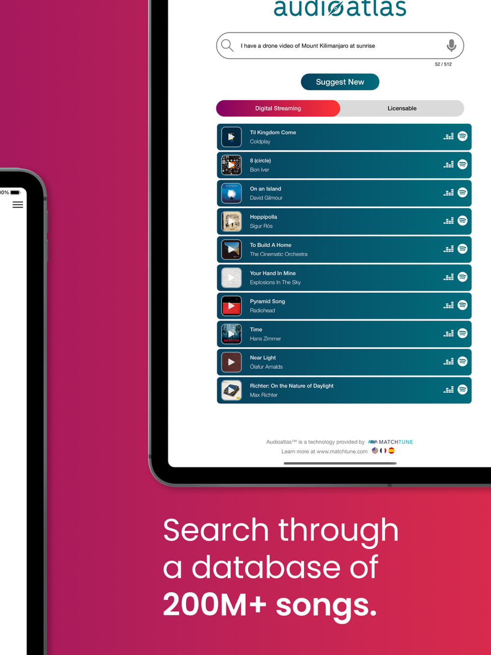 Audioatlas is a natural language search engine, developed by MatchTune, that enables users to find the most fitting music based on any imaginable search prompt, within a global database of over 200 million songs.