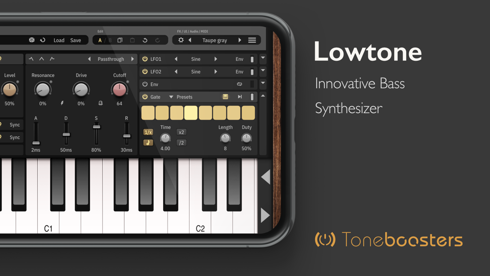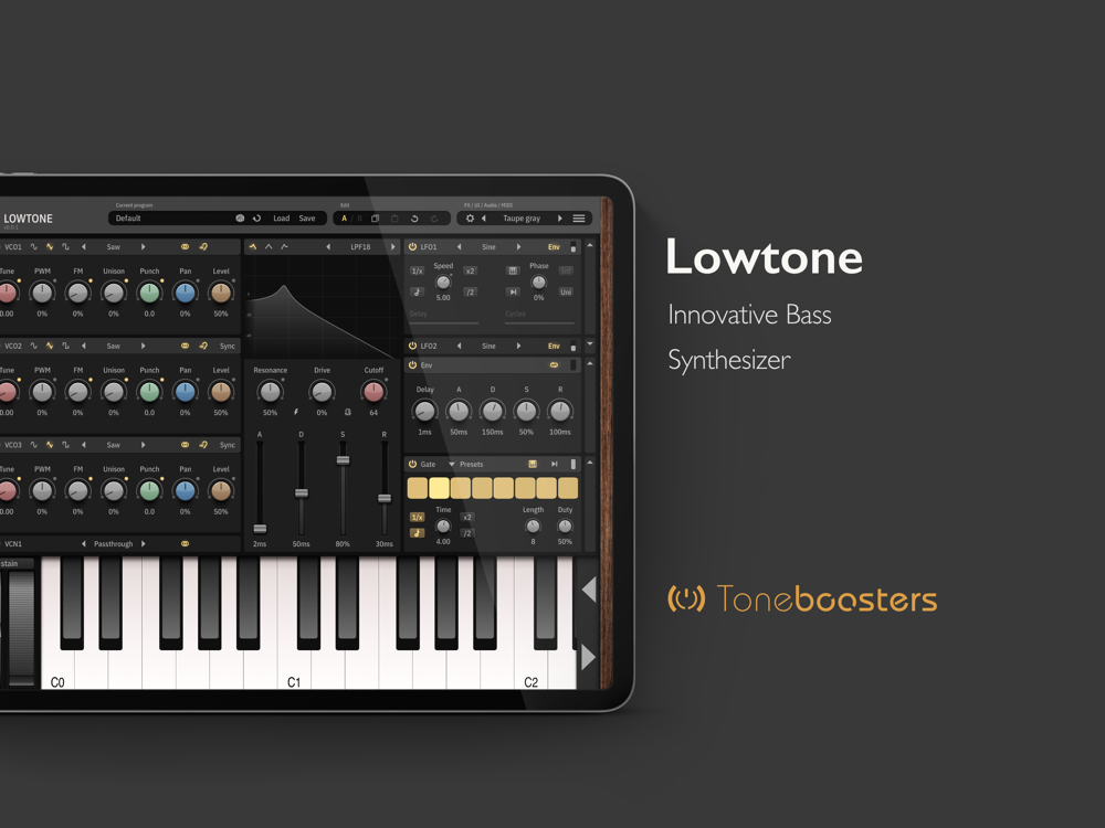 TB Lowtone is an innovative bass synthesizer app and AUv3 / IAA plug-in featuring three analog-simulated, voltage-controlled oscillators with a large variety of waveform algorithms, continuous pulse-width modulation (PWM), Frequency Modulation (FM) and oscillator hard sync, complemented by a voltage-controlled noise synthesizer, parameter modulation a re-designed non-linear voltage controlled filter. TB Lowtone is the world's first bass synthesizer featuring loudness-domain harmonic synthesis, creating deeper, more consistent and production-ready bass sounds compared to conventional synthesizers operating in the (linear) amplitude domain. TB Lowtone also features a smart randomizer that generates new patches with a single click, and which learns from the patches you have already created to generate new, personalized patches! Loudness-domain synthesis Loudness perception of tones and harmonics is known to be highly non-linear and intricately frequency and level dependent. Equal loudness contours, or Fletcher-Munson curves demonstrate this drastic effect for sine tones, which is especially relevant for low frequencies. The loudness of a synthesizer bass note, and all its individual harmonics, will therefore depend strongly on what note you play on your synth's keyboard. To overcome the resulting inconsistencies in loudness and timbre, TB Lowtone features innovative, loudness-domain synthesis algorithms that adjust each harmonic individually to compensate for loudness deviations across frequency. Modulation and FX TB Lowtone provides two extended low-frequency oscillators (X-LFOs) featuring a wide range of waveforms. The LFOs can be beat and key synced, with a configurable onset delay and a specific number of cycles to run. In addition, a conventional ADSR envelope with configurable onset delay is provided. To top if all off, a gate editor designed to quickly put together modern production modulation patterns is available as well to modulate a range of VCO, VCN and VCF parameters. Reverb, chorus, and delay effects and a high-quality peak limiter are provided to produce production-ready sounds. Features: - 3 VCOs plus a VCN featuring a wide range of waveform algorithms - All VCOs support hard sync, pulse-width modulation (PWM) and frequency modulation (FM) - Lots of filter types for spectral shaping - 2 LFOs, one extra envelope and a gate editor for parameter modulation - Pro quality effects (reverb, chorus, delay, peak limiter) - Unique loudness domain synthesis algorithms - A smart randomiser that learns from your patches - AUv3 with resizable UI and dozens of color themes to choose from - Preset management including import and export options - Undo, redo, A/B switching - Inter-app audio (IAA) support What you should know: - Inter-App Audio (IAA) can only use one instance of this app simultaneously. We recommend to use an AUv3 host to use multiple instances. - Licenses acquired for this platform are not compatible with other platforms. - Audio Unit (AUv3) extensions require an iPad mini 2, iPad 4 or later models.
