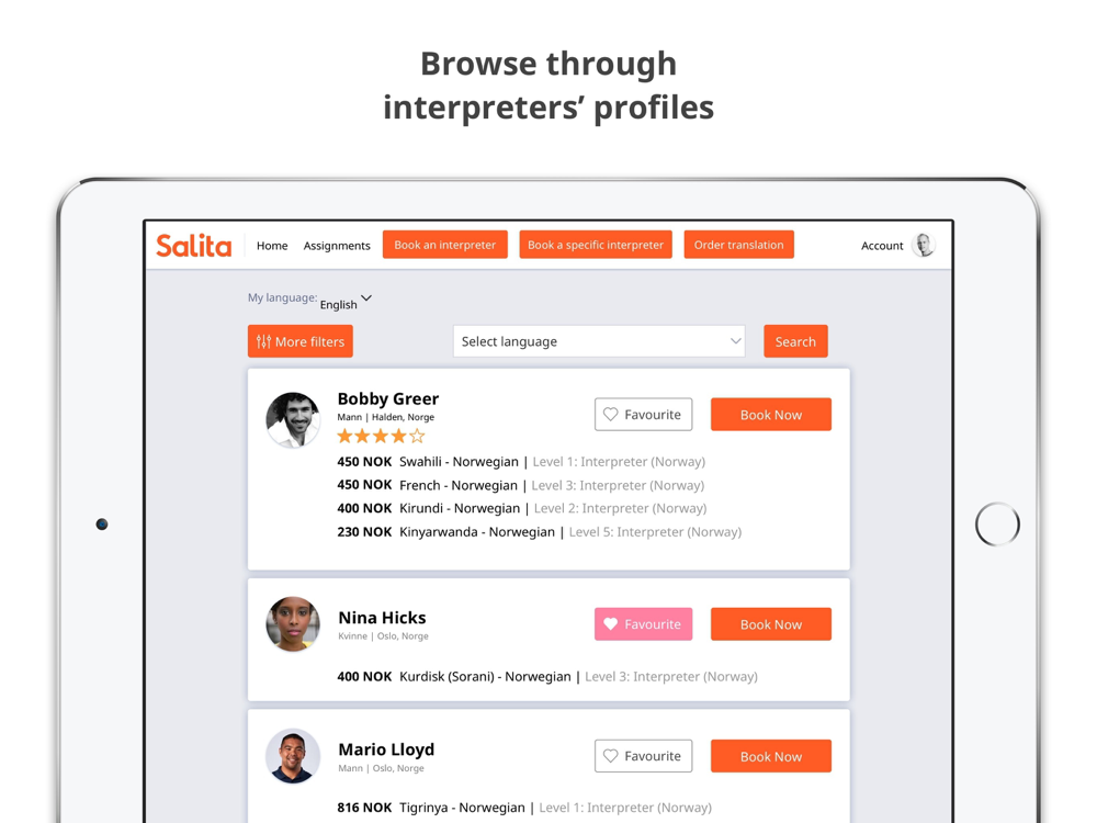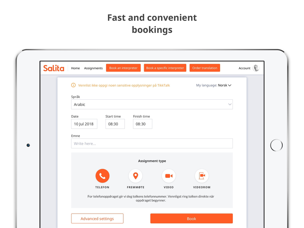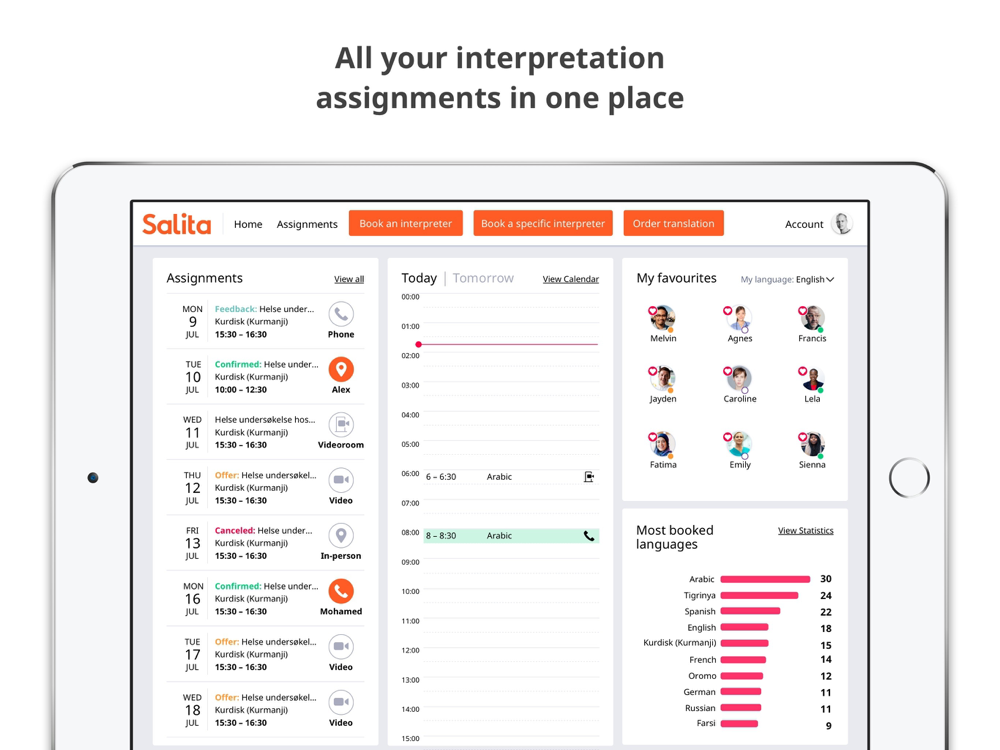 Vår tolketjeneste er en av Norges største private landsdekkende leverandører av språktjenester. SALITA leverer tolketjenester og oversetter dokumenter på over 150 språk. Kundenes språkutfordringer løses ved hjelp av skreddersydde tjenester utført av kvalitetssikrede, erfarne tolker og oversettere på de fleste språk og dialekter.