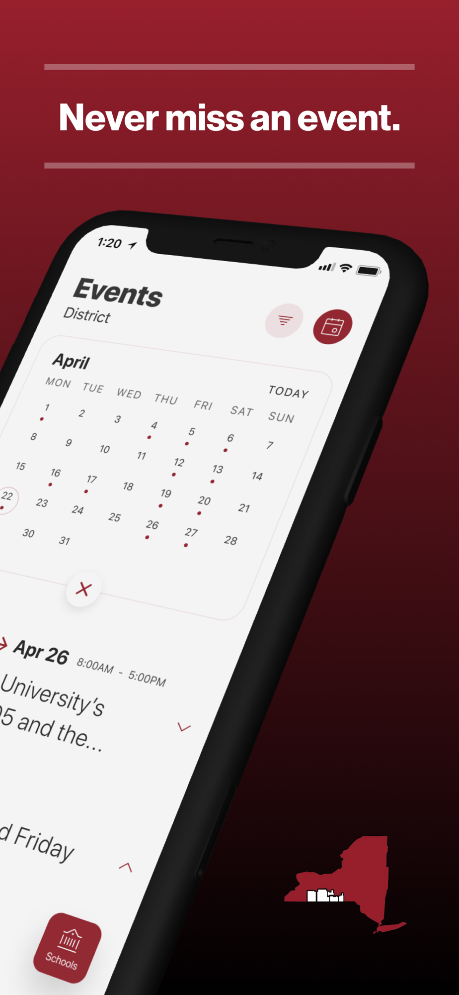 The event section shows a list of events throughout the district. Users can add an event to their calendar to share the event with friends and family with one tap.