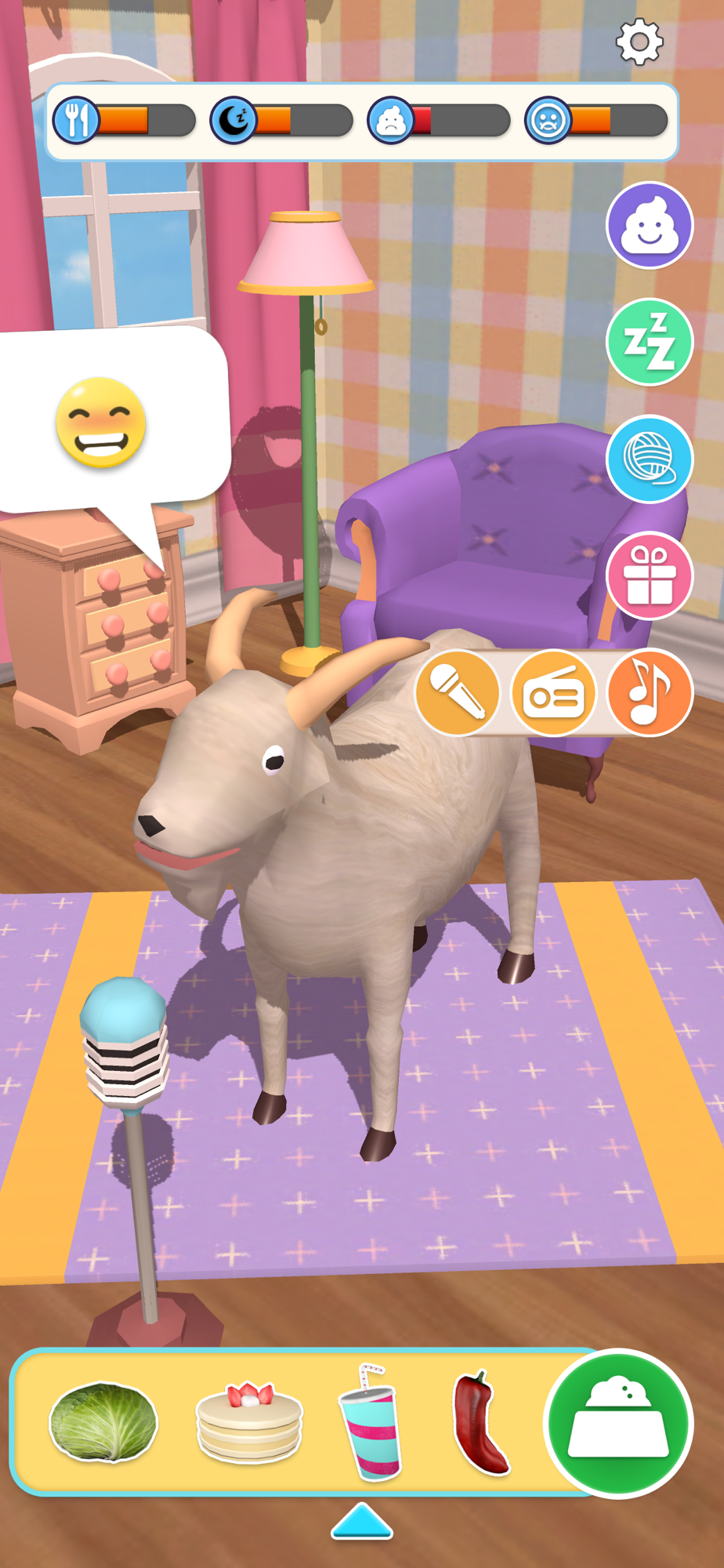 A simulator for a little goat. You need to take care of this little goat, give it some food, give it toys, give it games, and make it happy.