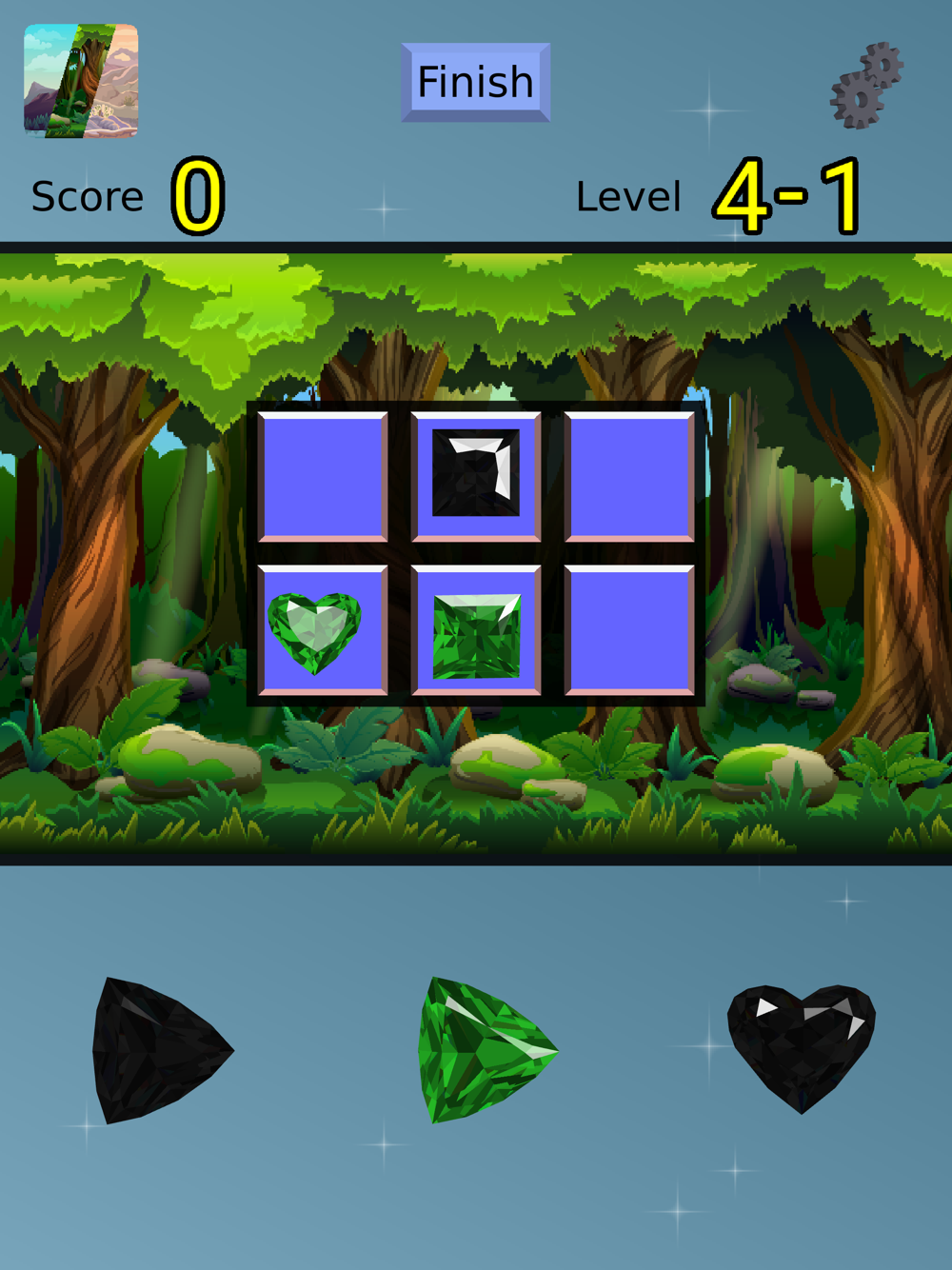 Place dazzling gemstones onto a grid so that all gemstones in a row have either the same shape or color - or both for extra points.