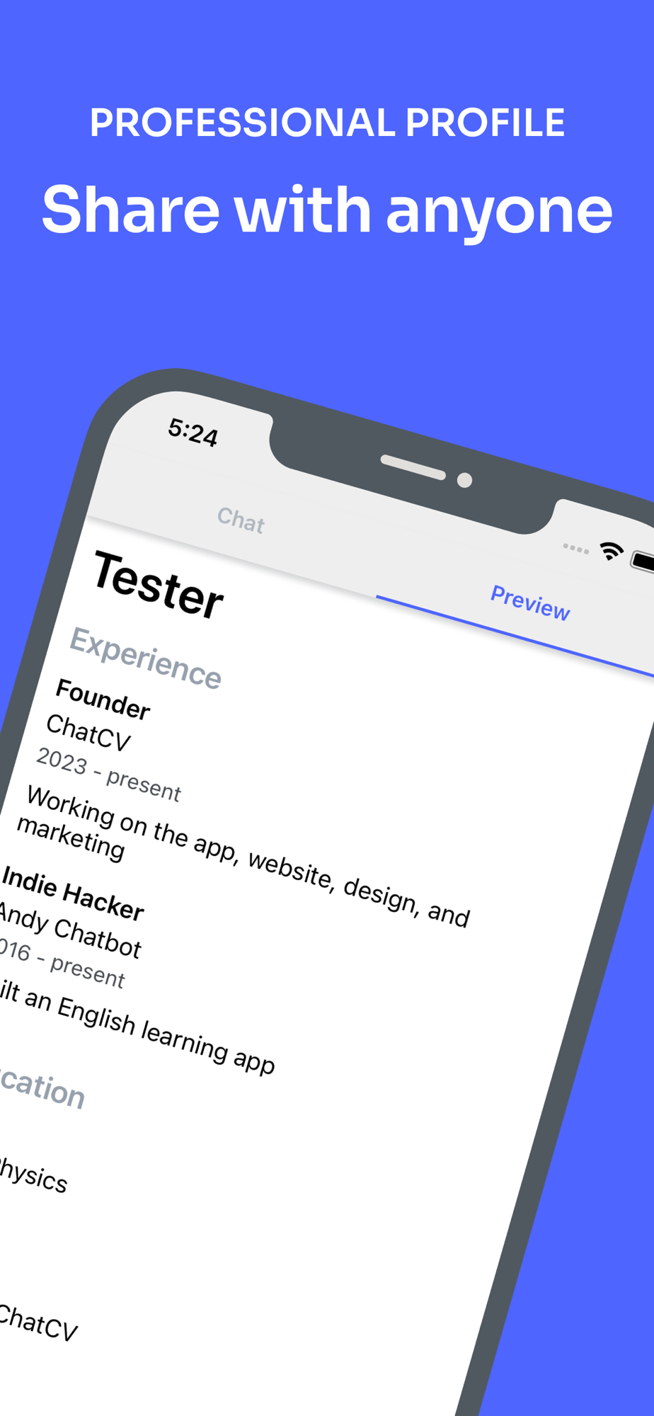 Introducing ChatCV - AI Resume Maker, the revolutionary app that makes creating your professional CV a breeze! Forget about the hassle of formatting and editing your resume; just have a chat with our friendly AI chatbot, and your CV will be instantly available on the web. Stand out from the crowd and land your dream job with ease!