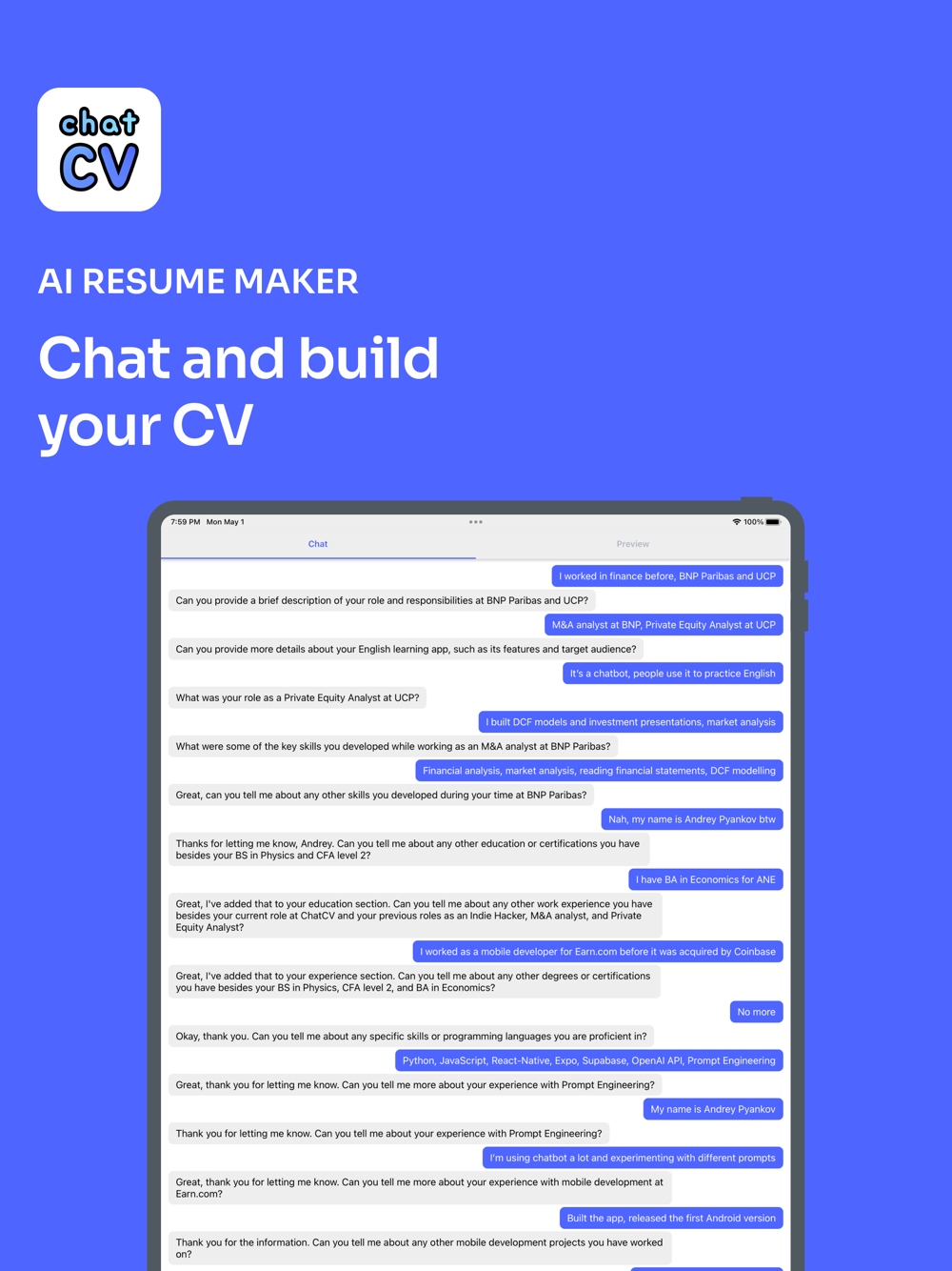 Don't let a poorly written CV hold you back from your dream job. Download ChatCV - AI Resume Maker now and start chatting your way to a professional CV today!