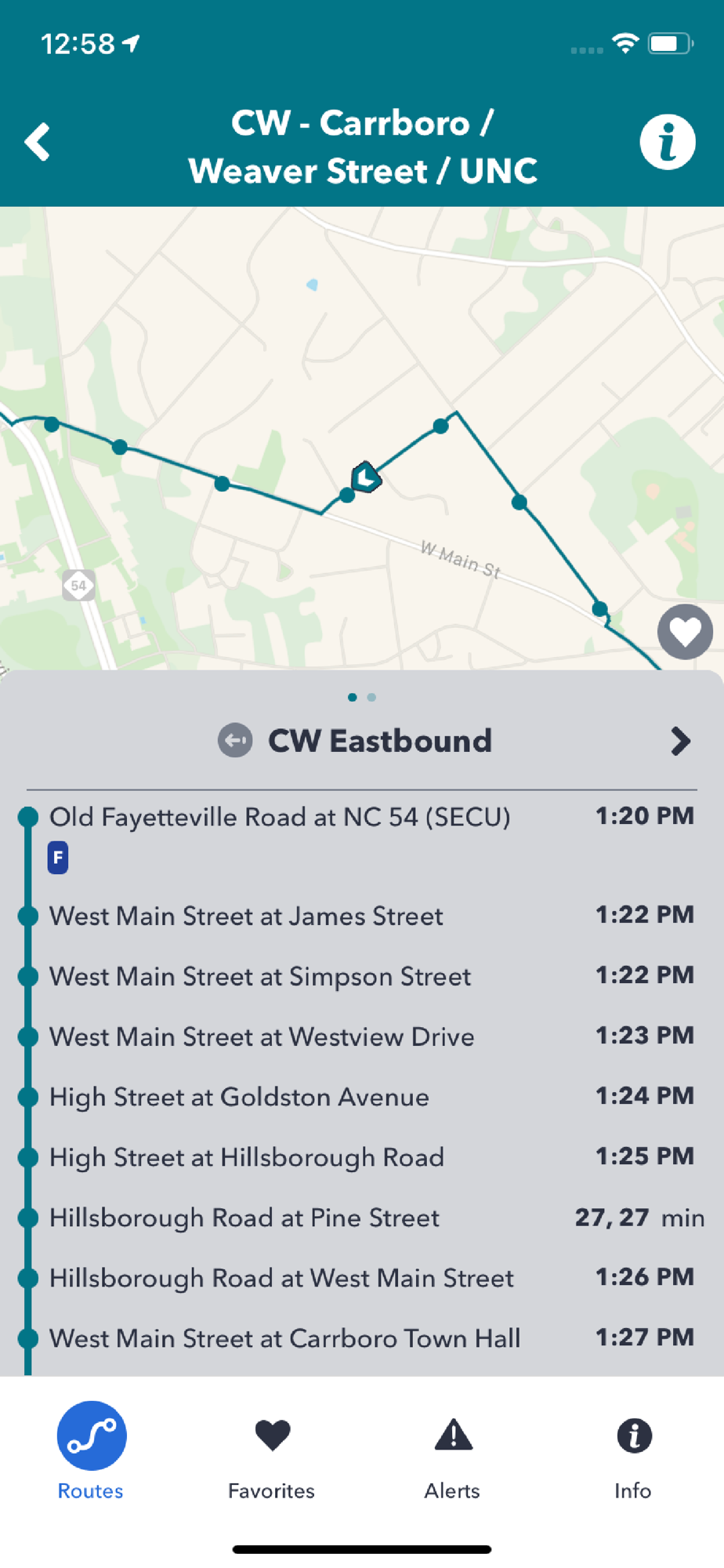 Provides real time tracking of Chapel Hill Transit buses serving the towns of Chapel Hill and Carrboro. Allows users to save favorite stops and create automatic reminders for bus arrival times. Displays up to the date announcements regarding service changes, weather delays, and other news.