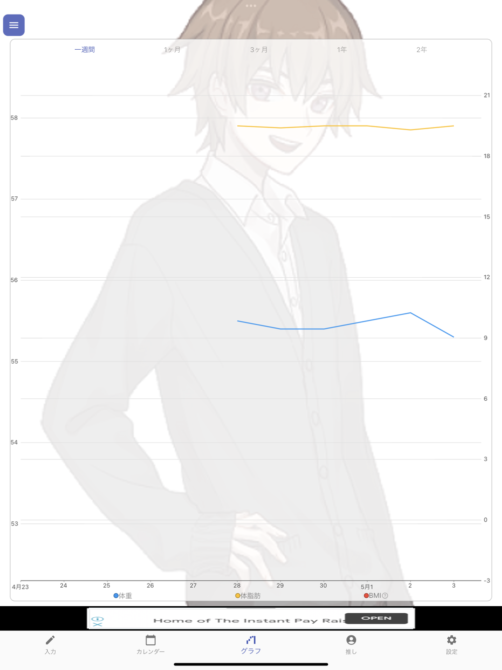 好きな推しを背景、アイコンに設定できるだけでなく、シンプルな入力画面、見やすいリスト形式のカレンダー、体重、体脂肪、BMIの推移が直感的に分かるグラフ機能があるのでとても楽に体重記録ができると思います!