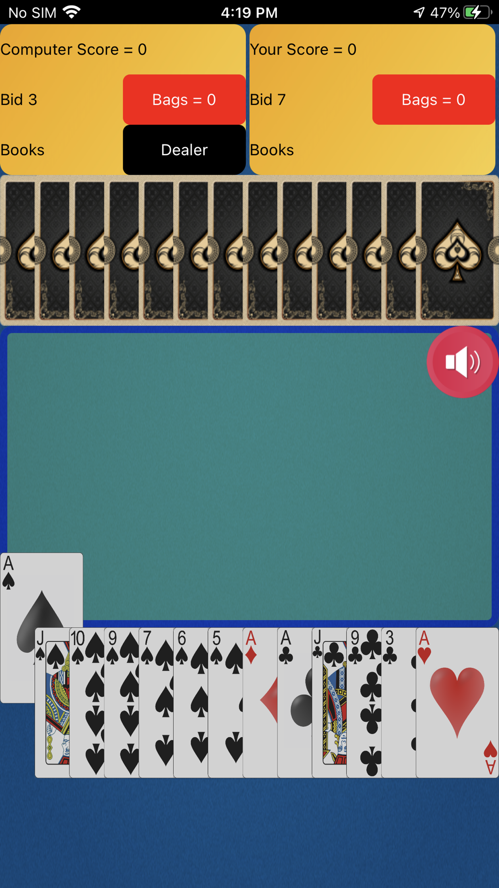 Players take turns leading with a card, and the other player must follow suit if possible. The highest card of the suit led wins the trick, and the winner of the trick leads the next one. The spade suit is always trump, meaning that a spade card will beat any card from the other suits.