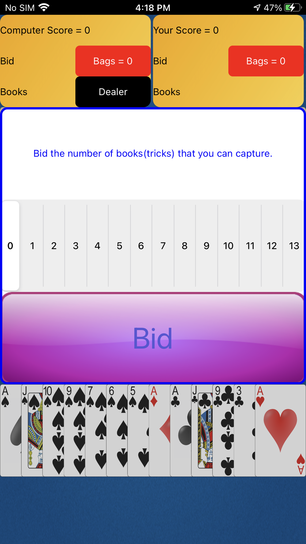 Players score points based on the number of tricks they win, as well as any bonus points earned from bidding before the game starts. The player who wins the most tricks in a round earns a bonus 10 points, known as a "bag". If a player accumulates 10 bags, they lose 100 points.