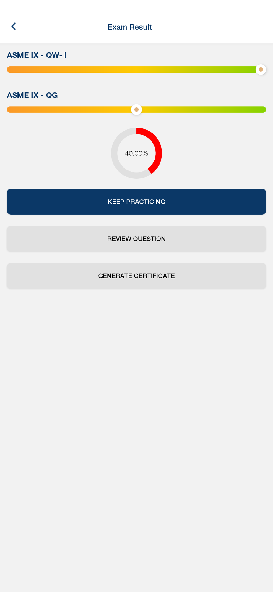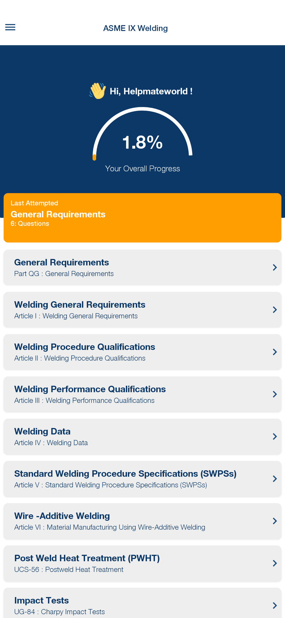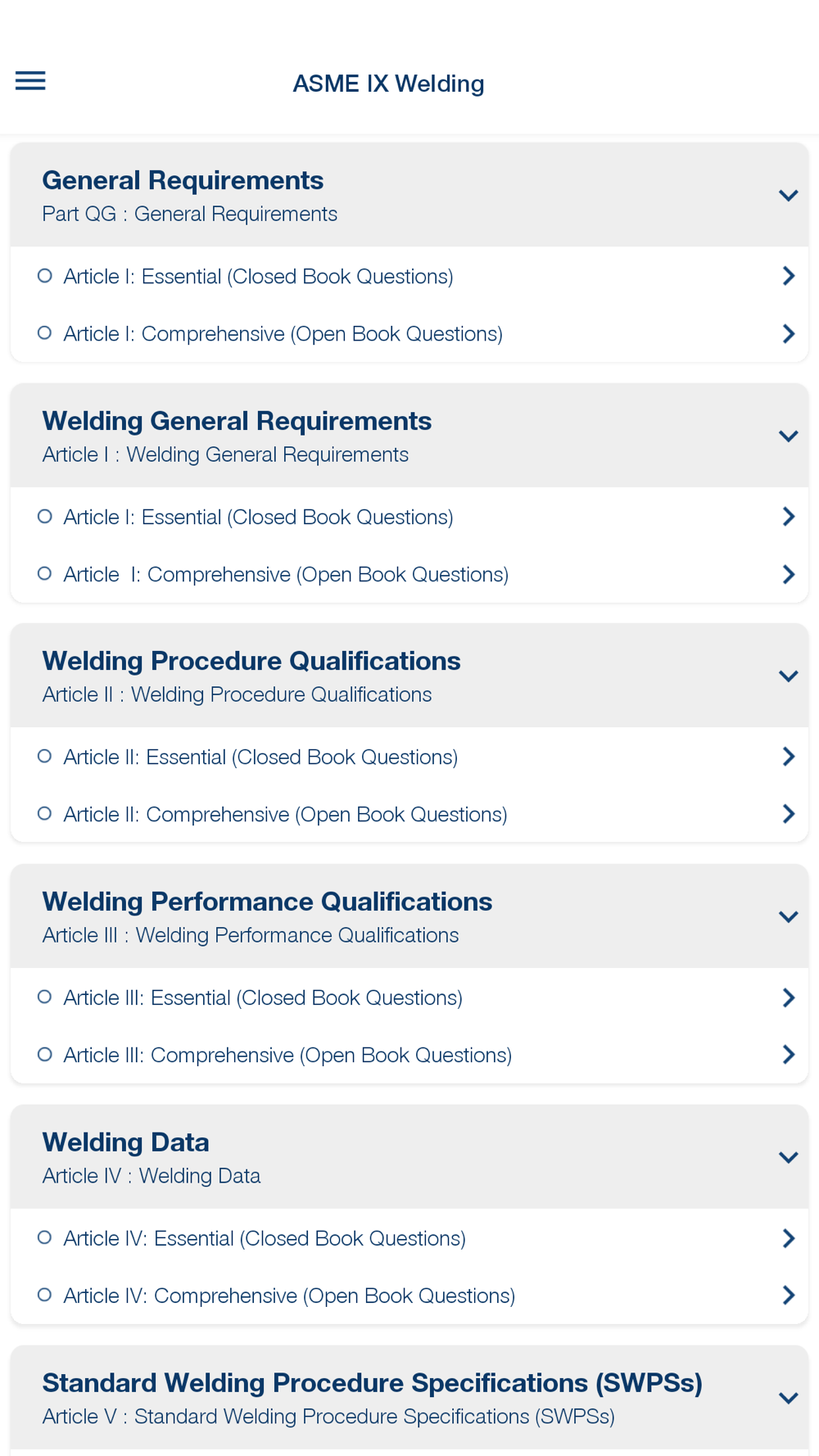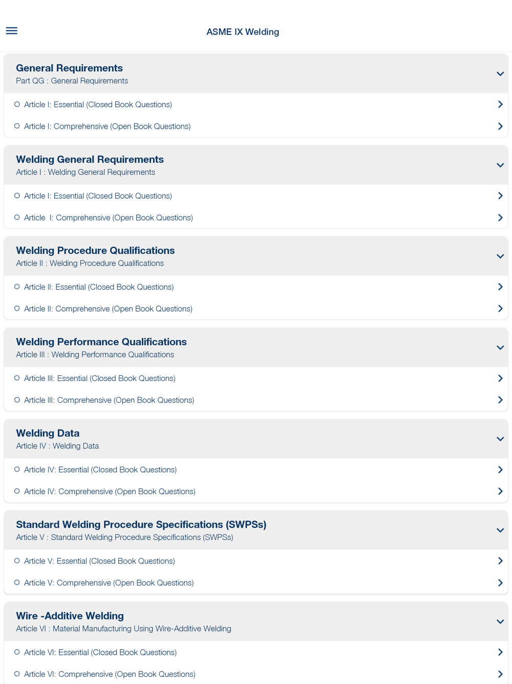 4. Challenge Mode: Challenge yourself and build confidence with the Exam Mode. Test your knowledge, hone your skills, and conquer the ASME Sec IX. This mode is designed to improve your self-assessment, boost confidence, and prepare you for success.
