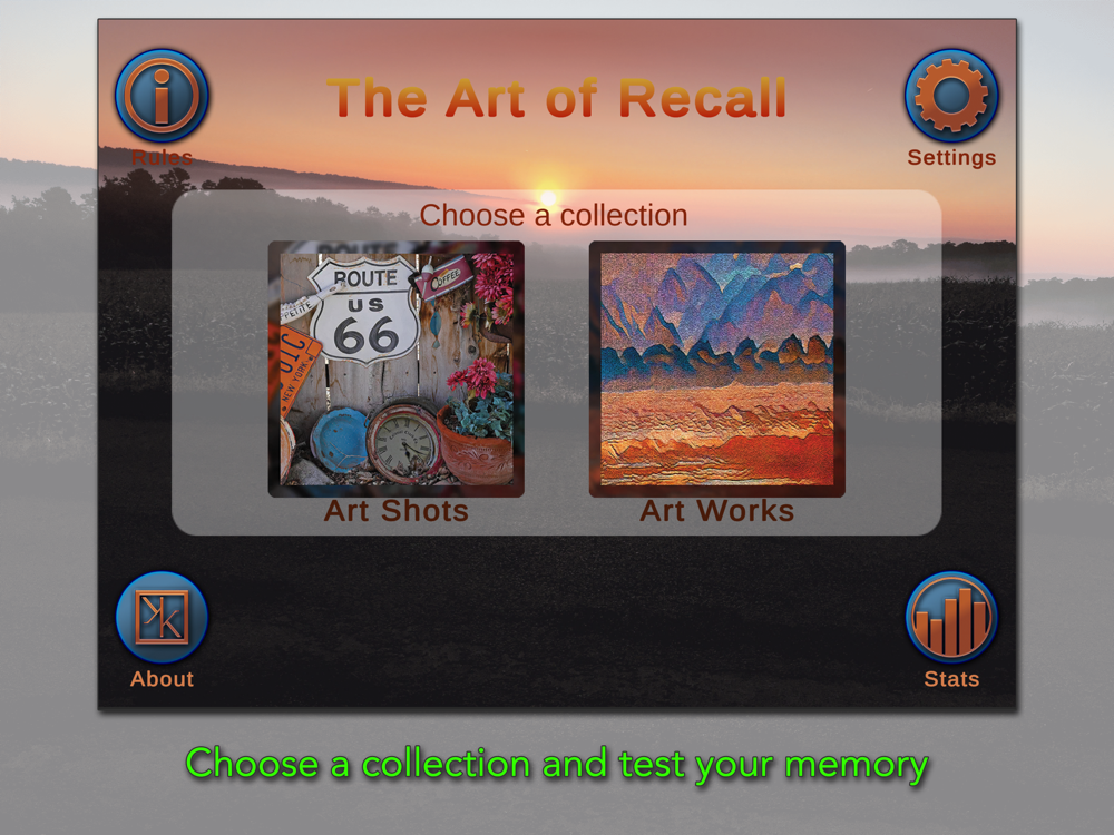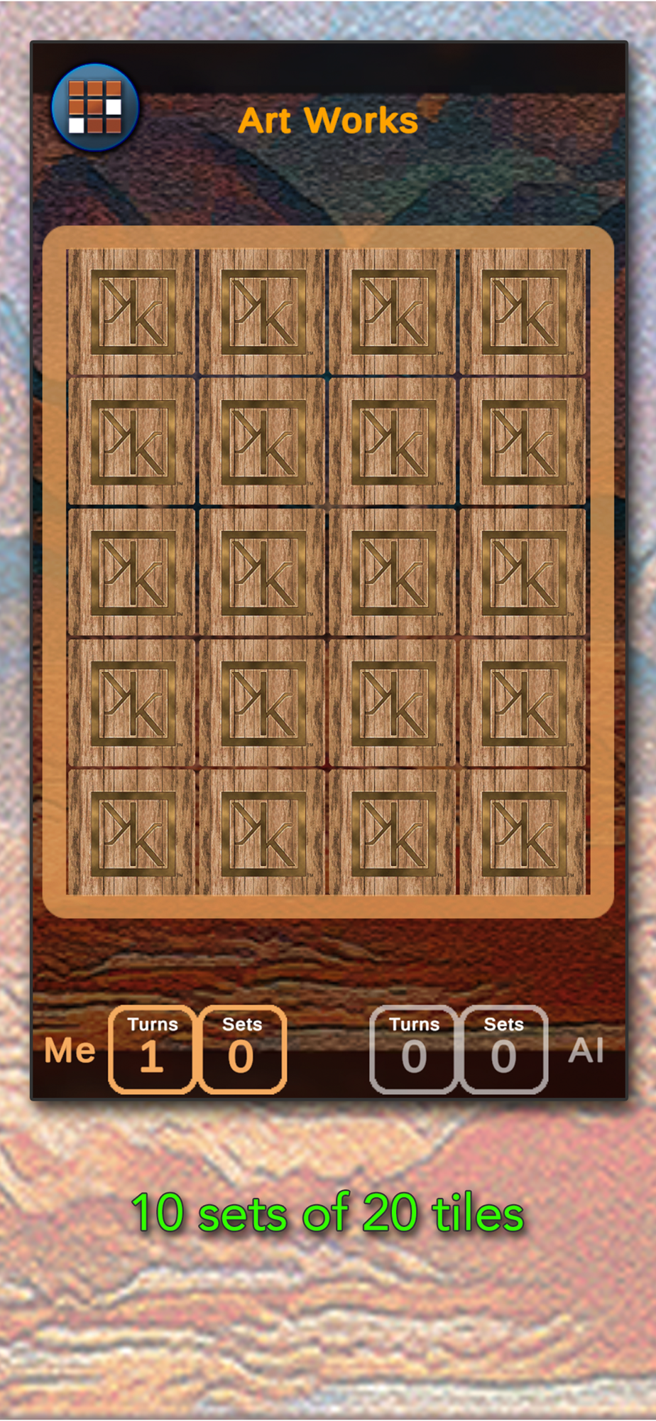The Art of Recall includes 2 collections of 20 tiles of 10 sets. The game can be played solo or against the AI. The goal is to find and match tiles to create sets. When playing against the AI try to collect the most sets. If playing solo try to collect all sets in as few turns as you can.